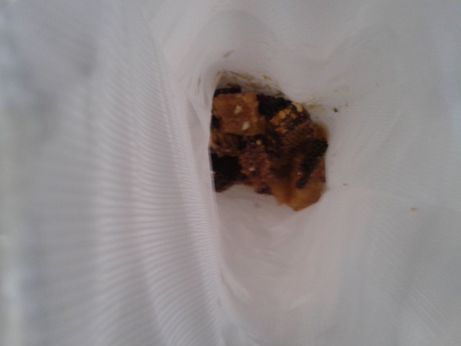 I HAVE A TREAT! Pictures of my partial whole hive mead. My father found a hive that only had drone brood as they had no queen and no viable eggs for a queen cell. I tore into two frames for: Honey, Pollen, and Brood. I used a capping tool to pull the caps off of the honey and to expose brood to the liquid. Then removed sections based on the wires that hold the comb in place.