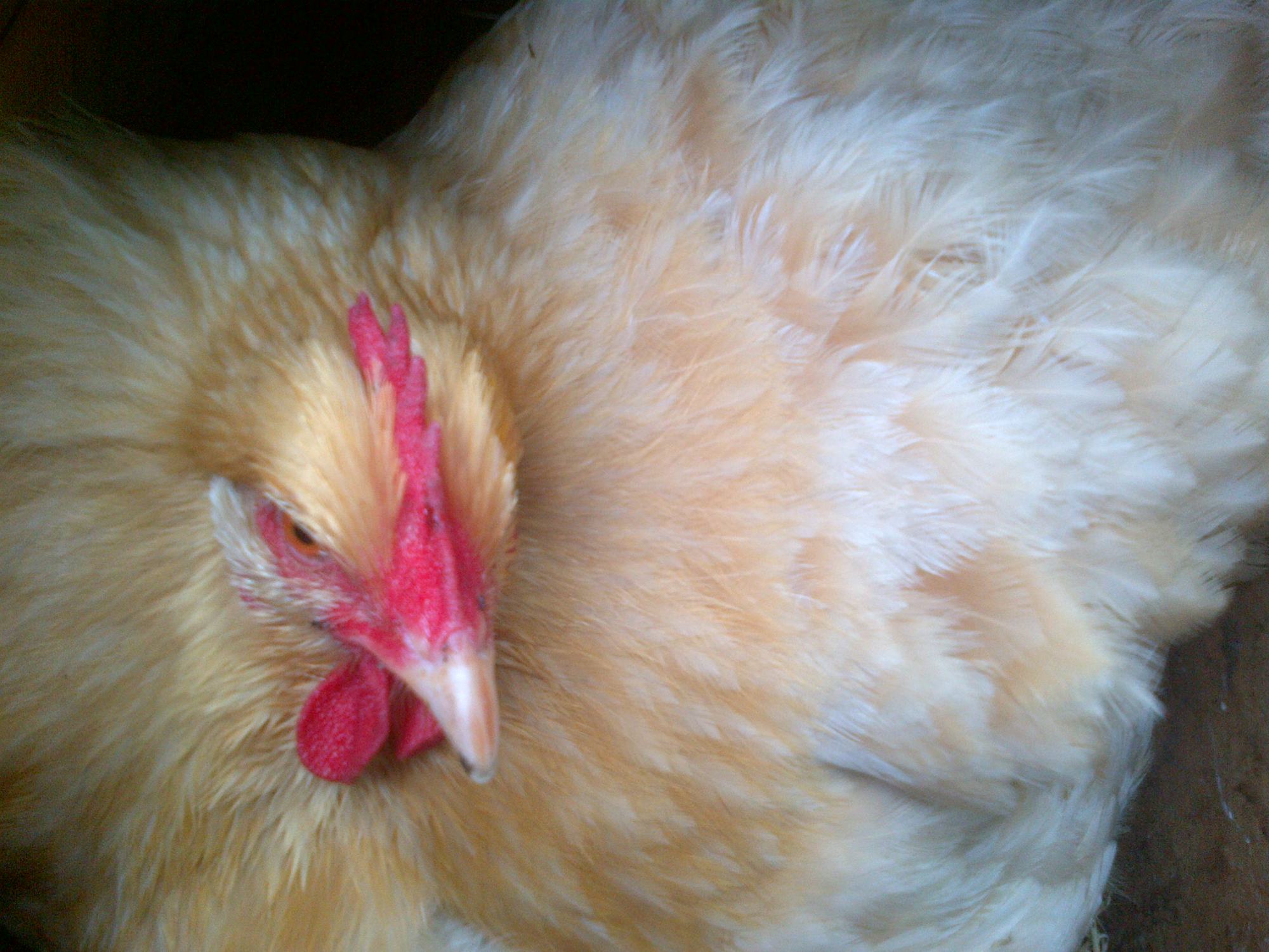 She'll come off the nest when I go out with food and treats and will stay out as long as I am there, but when I go out, she runs back to the nest. I think she's scared of the rooster