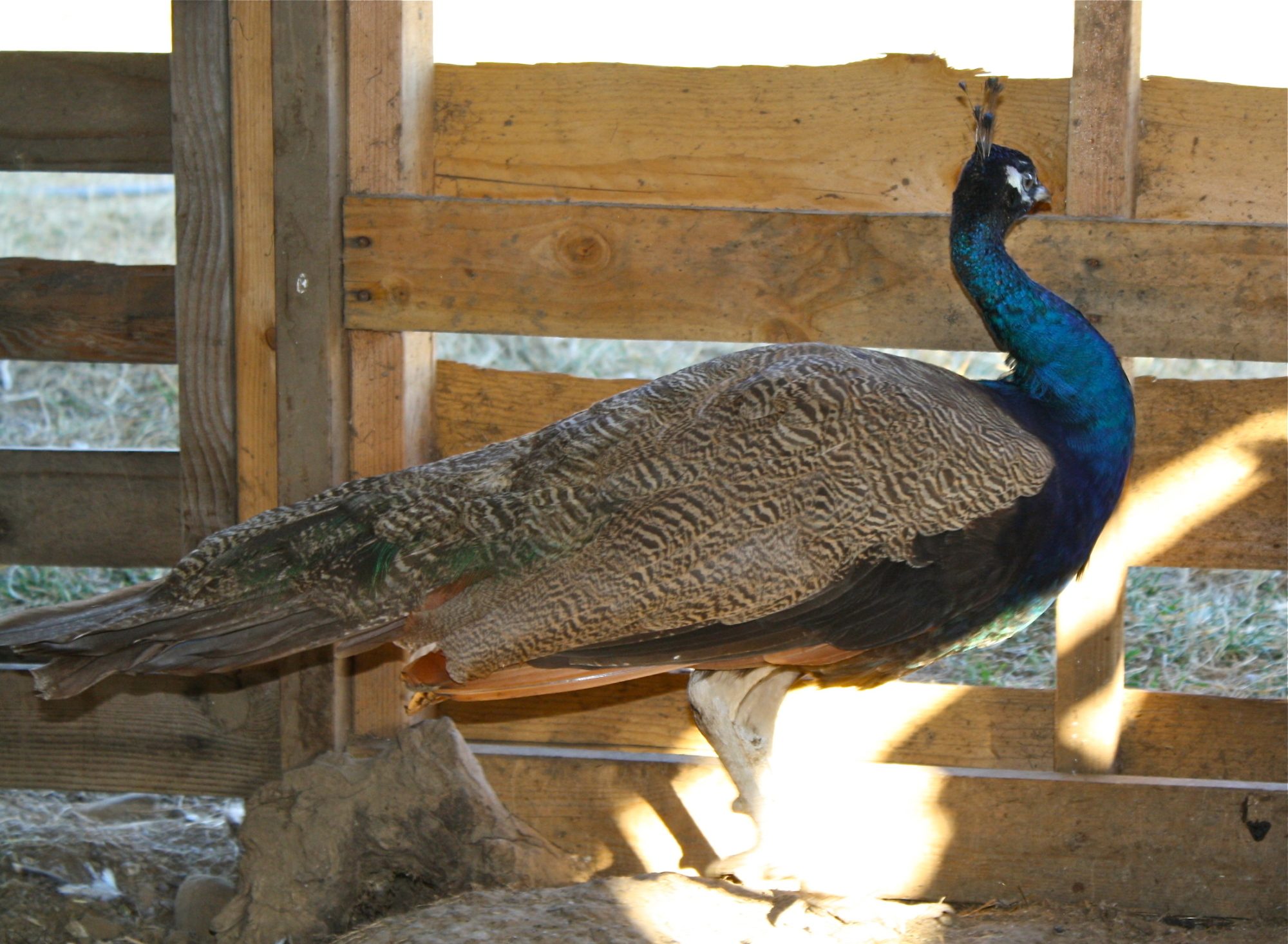 We have a few peafowl, we *think* one white hen (but need to get a pic of her/him), one India Blue, one Purple black shoulder? and another that I am not quite sure of (will put pic here).