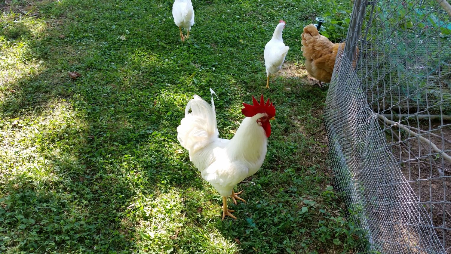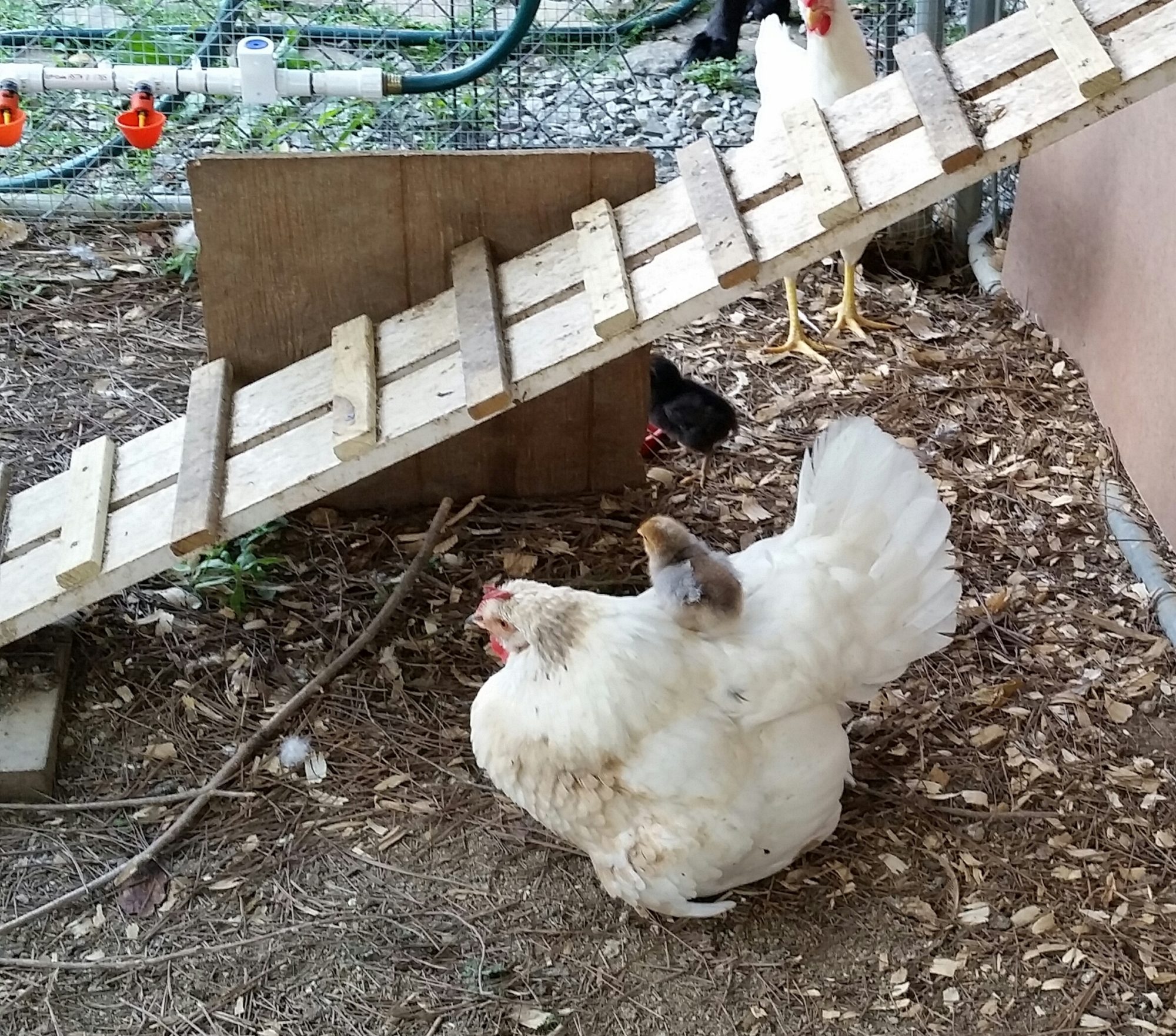 They quickly learned from mama how to go up the ramp at night. She nestled down in a different corner for a couple weeks, which was perfect timing for the white leghorn mama's chicks to start hatching. The Fourth of July brought us 7 more little fluff balls of various colors!