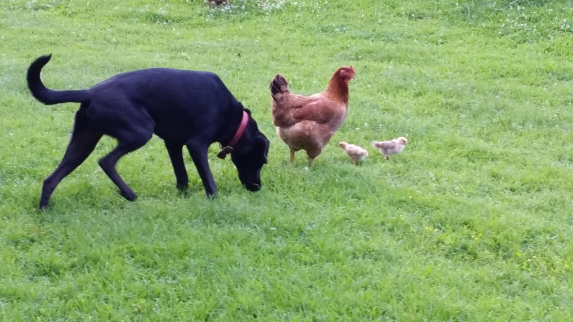 She has had her hands full, but has done a great job keeping her troupe together. All nine are healthy and doing fine. They love free-ranging with their mamas, even heading down to the creek for a cool drink! Our black lab is a great protector and follows them everywhere. I think he worries about them - go figure!