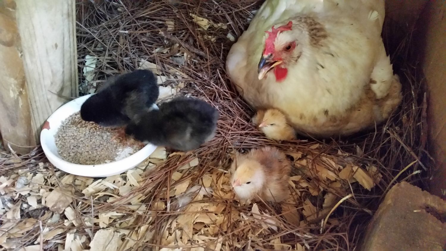 I immediately put the first two that hatched under the leghorn into the abandoned (but cleaned) broody box, transferred the rest of the as yet unhatched eggs there as well. She sat on them just fine and the rest hatched by late evening.