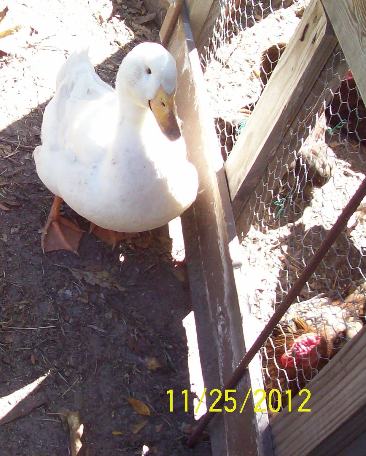 This is the Perkins, Aflac. He thought he was a rooster. One of his hens is on the other side of the gate of our old pens.