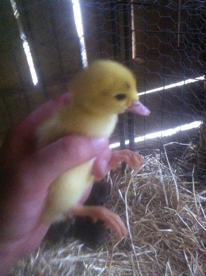 I'm thinking this one is a Muscovy but will be white (though it's parent's aren't). Day old.
