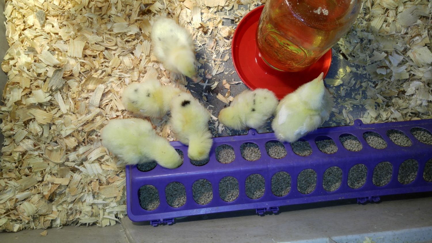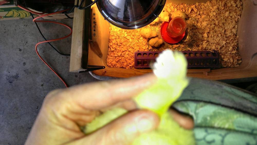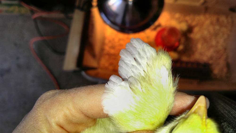 I have 6 california white chicks 4 have spots on them and 2 don't. They are 2 days old in the pictures below one solid yellow is bigger and the wings are different it is only a few hours older than the other 5. The other 5 wings are all the same by the pictures can anyone tell me the sex of my chicks. The bigger chick is the one facing the water jar its wings is the following picture and the other 5's wings are like the last picture