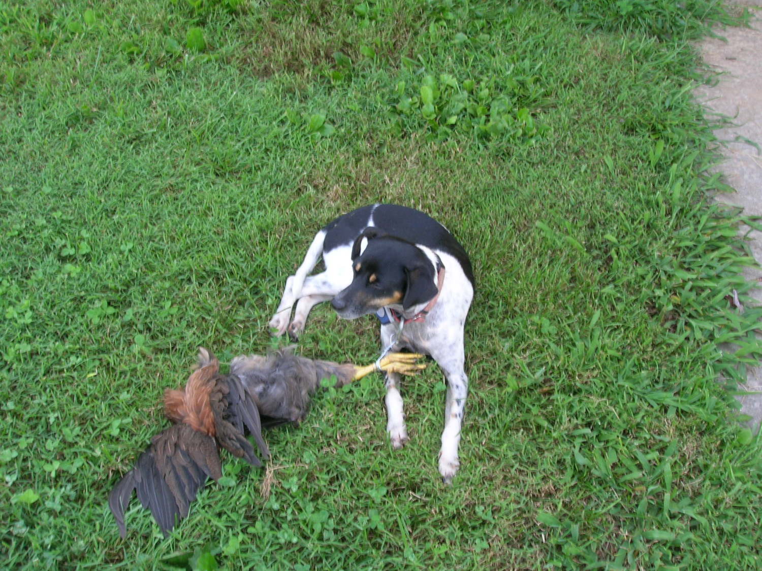 far he has killed almost all of them, like 20+. He will go out of his way to chase and then eventually maul any baby chickens he sees to death.![]()