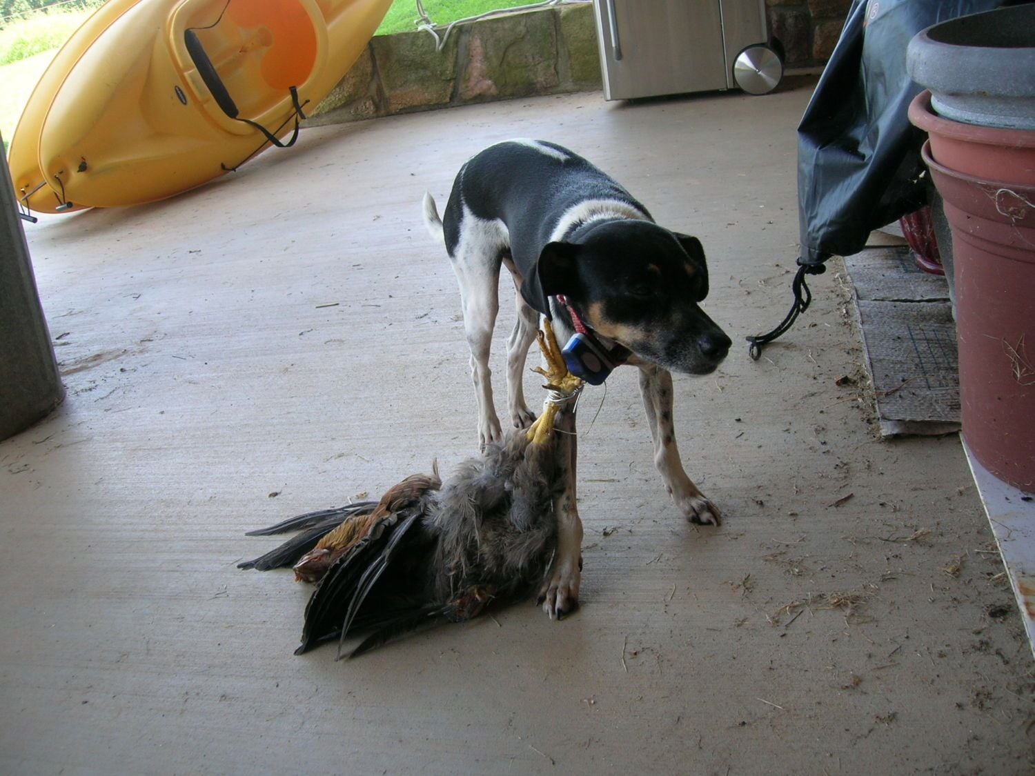 I just want to address a couple of things here. Firstly, I don't doubt that this works. Lots of things that are not a good idea work. I also want to add that I'm approaching this as someone studying behavioural science with an emphasis on animal behaviour.I have two Mountain Feist, bred to hunt just about anything. They have been paying way too much attention to my coop, now that I moved it inside their fenced domain. They bark and go crazy anytime the chickens are in an uproar about something, and they have made my chickens really skittish so that I can't get them to cozy up to me when I bring treats. Yesterday, I had the coop door closed but not latched and one of the hens got out and was promptly killed by the dogs. My yoga instructor told me an old country solution to this problem worked with her dog. So, today when Larri started barking and being aggressive towards the chickens, I went and got that dead chicken and wired its feet together. Then, using a carabiner, I hooked the wire to his collar. I am going to make him drag it around all day and then let him loose tonight. As you can see in this photo, he was instantly shamed and he has hardly moved since then. This is a wonderful (although gross) punishment because I didn't yell, hit, or scold. I'll letcha know how his behavior changes after this experiment!