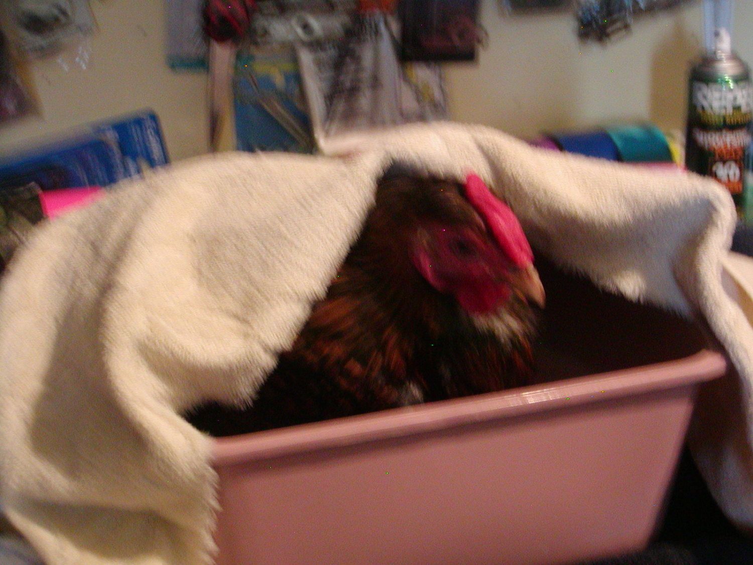 I placed the soiled hen in the bath, settled her in comfortably, then draped a towel over her so she couldn't see anything, the towel completely covering her head. I went on about my chores and came back half an hour later, and finished the wash job.