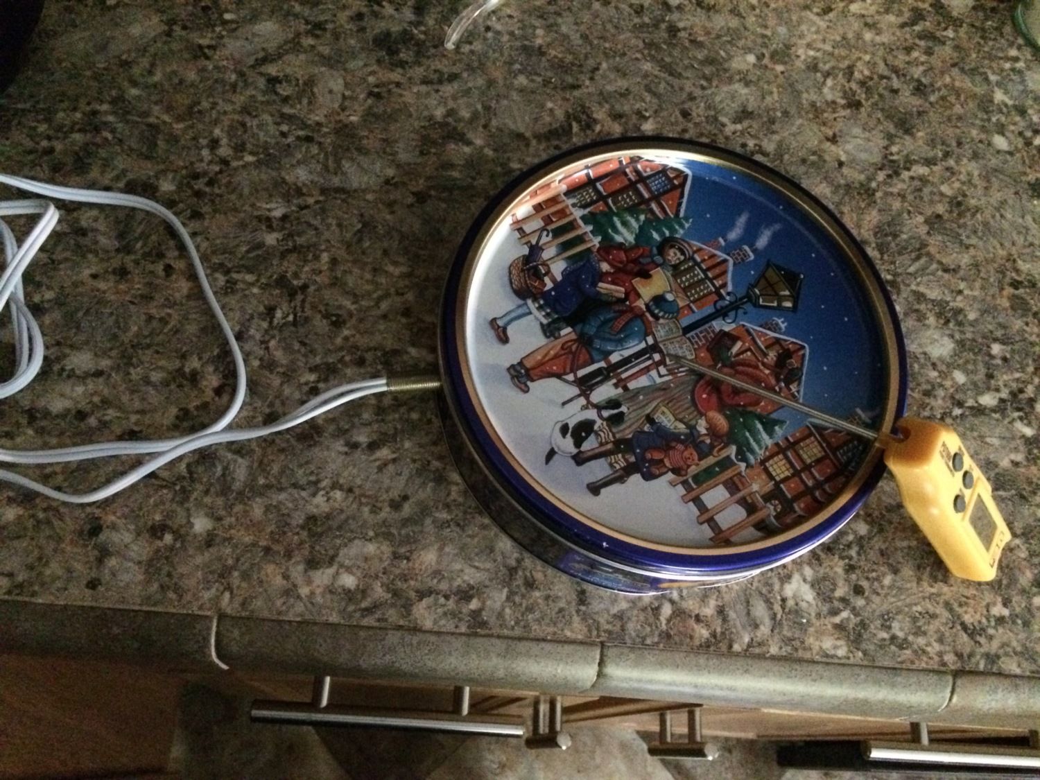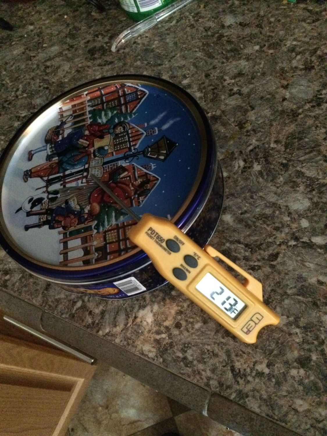 Has anyone taken a thermometer to their cookie tin water heater? I'm interested in what wattage bulb you have, the diameter and depth of the cookie tin, and what temp the outside of the cookie tin is.
