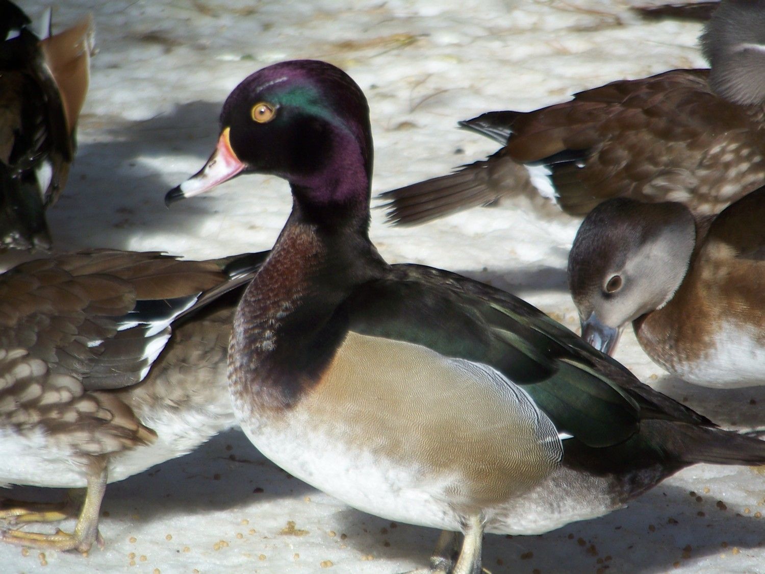 The wood duck hen I hatched this spring has the drake coloring mutation. The hybrid below the hen is a wood duck/ Ring bill. I had a ring bill fall in love with a woodie hen.