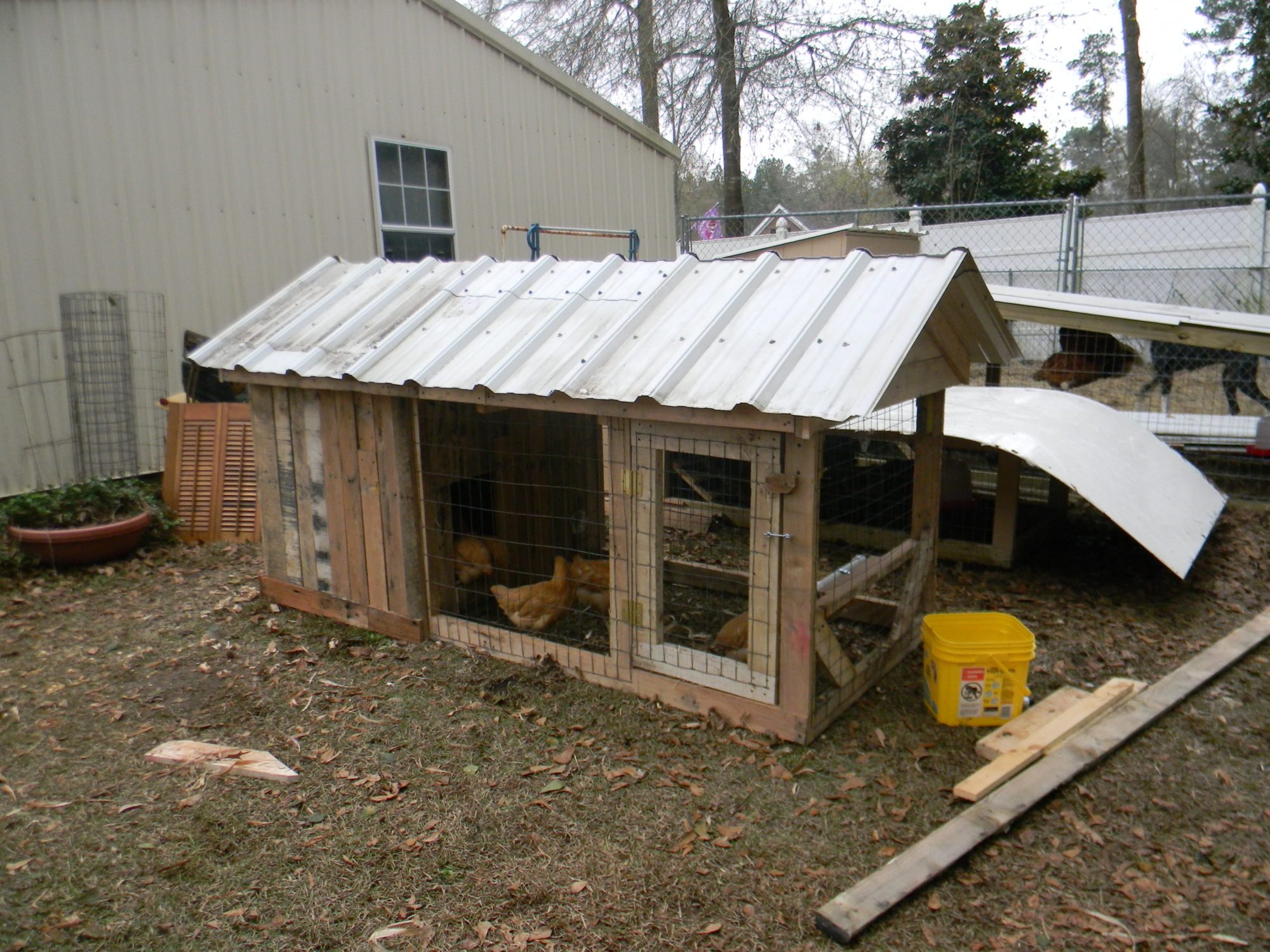 I think when using reclaime wood or pallets, have an idea of what size you want to build but don't get locked into it- I wanted to build something 8 1/2" long because the way the sheet metal roofing lays out, but ended up with a coop that was 95" long inside due to the runners being chewed up on one end from being dragged by a fork truck.