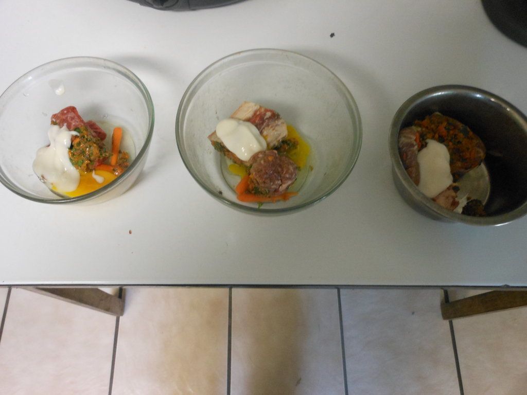 I know there are many opinions about vegetables but after reading a lot of information about the pros and cons I decided that we will add veggies. Absolutely no grain, though, of course. We blended up collard greens, carrots, and a couple strawberries in the food processor and divided up little baggies of meat with some of that and put them in the fridge for the first five or so days. Jackie is Border Collie-sized, but has a weird metabolism and has done good eating less kibble than Dan, who is a little under 30 pounds. She was eating 1 cup a day while he was eating 2 because when she was eating 2 she actually got a bit pudgy