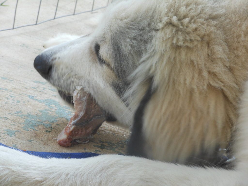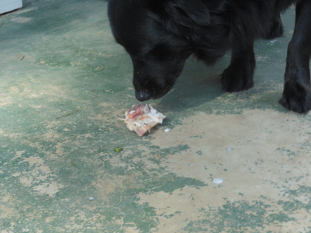 Tonight they got their first raw meal, which was the meat and a spoonful of veggies, a spoonful of yogurt, and an egg. Does this sound about right? They absolutely loved it, although Dan was a bit confused at first. Jackie and Homer both gobble their food, which I know is not good, especially with large dogs like Homer being prone to bloat, but having to stop and chew the meat and bones really slowed them down. Dan tends to eat very slowly, but once he figured out it was food he seemed to want to eat it and didn't pick at it like he does kibble (he actually will take mouthfuls of kibble and eat them in other parts of the house).