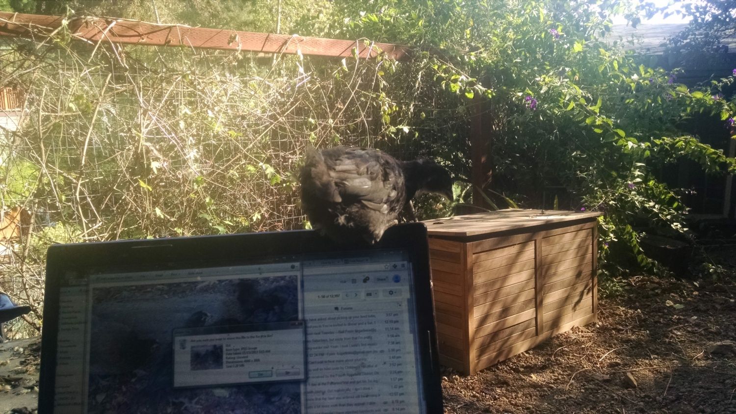 We had rain yesterday also .. actually, quite a big storm. I had to race outside and airlift the Jelly Beans and Tina off the ground and into their coop before the storm hit. Luckily Tina seemed to know something was coming and she stayed in the nest box with them. I was a little concerned that because it was not actually raining at that time, she would just wander back out again. Luckily I did not leave them to hide under the coop; when the storm had passed there were little swimming pools in the holes Tina had dug during scratching lessons, definitely deep enough for a chick to drown in.