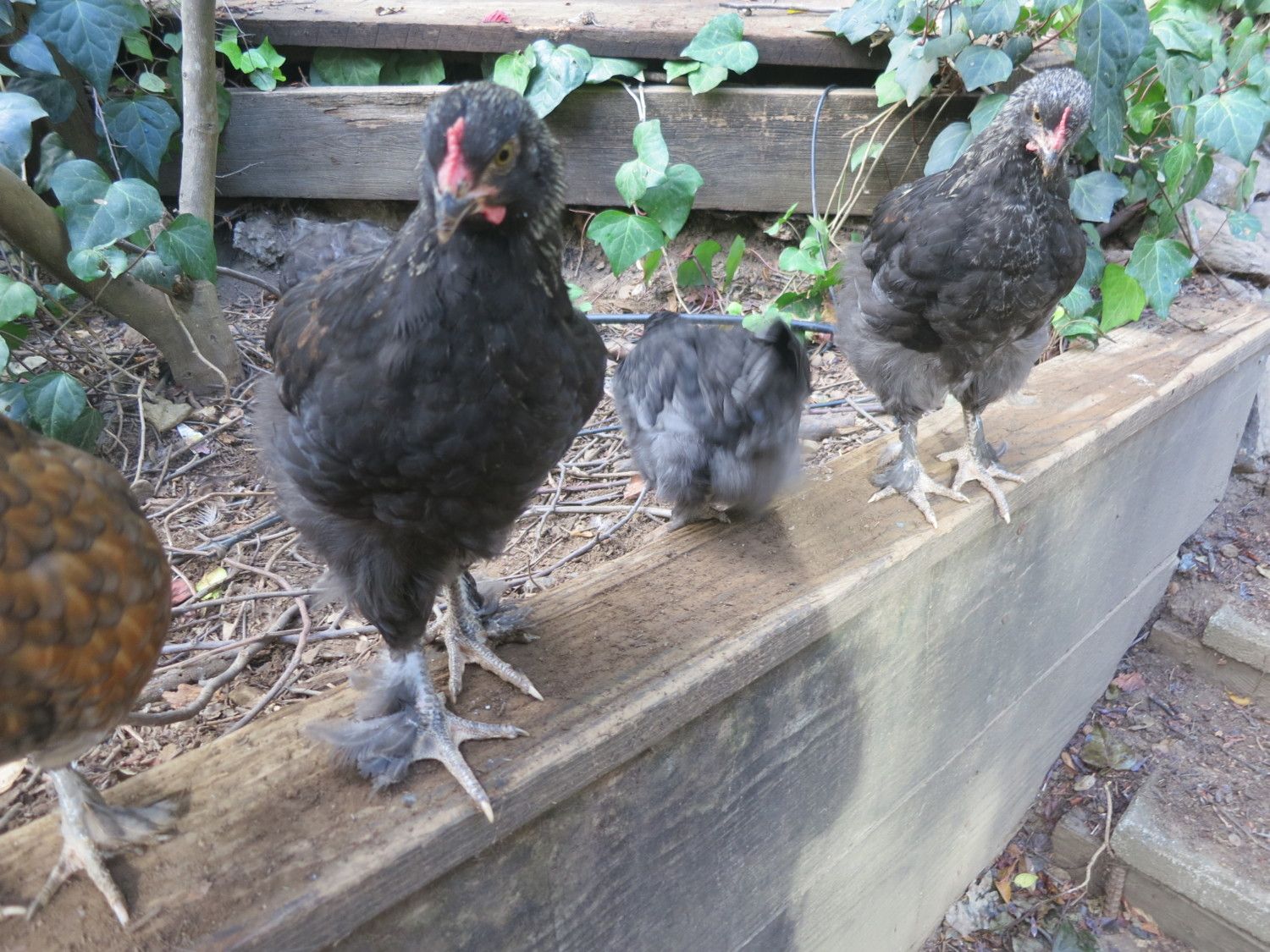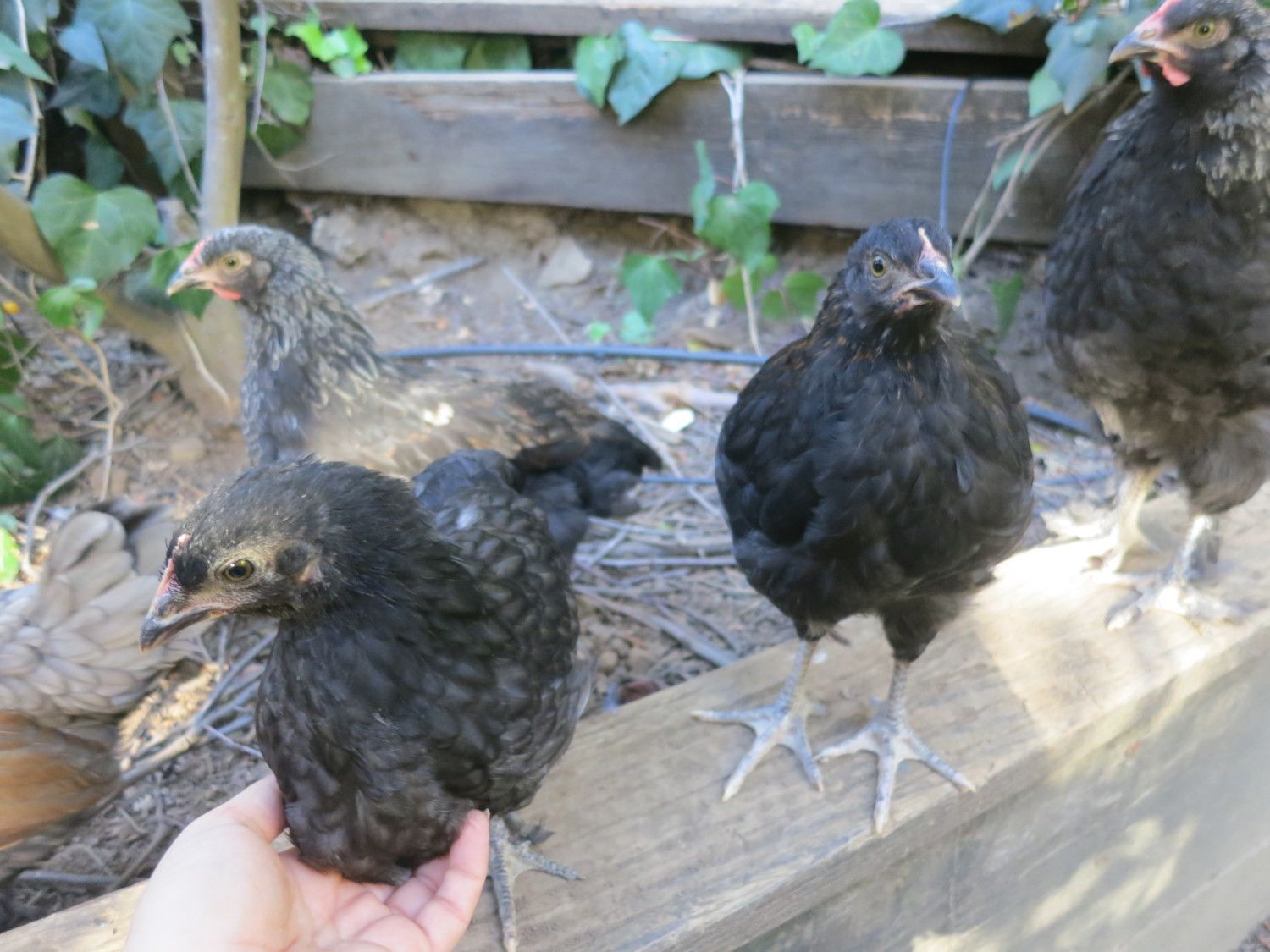 I spent some time with the beans during the week. They both have black (or very dark) skin and while Spot is looking very Silkie-like (not pure), Gloria is definitely Frizzle. Spot has a single comb similar to Tina's, Gloria has what looks like a rose comb. Still got no idea if they are boys or girls and they have me scratching my head as to just what they are going to turn out like
