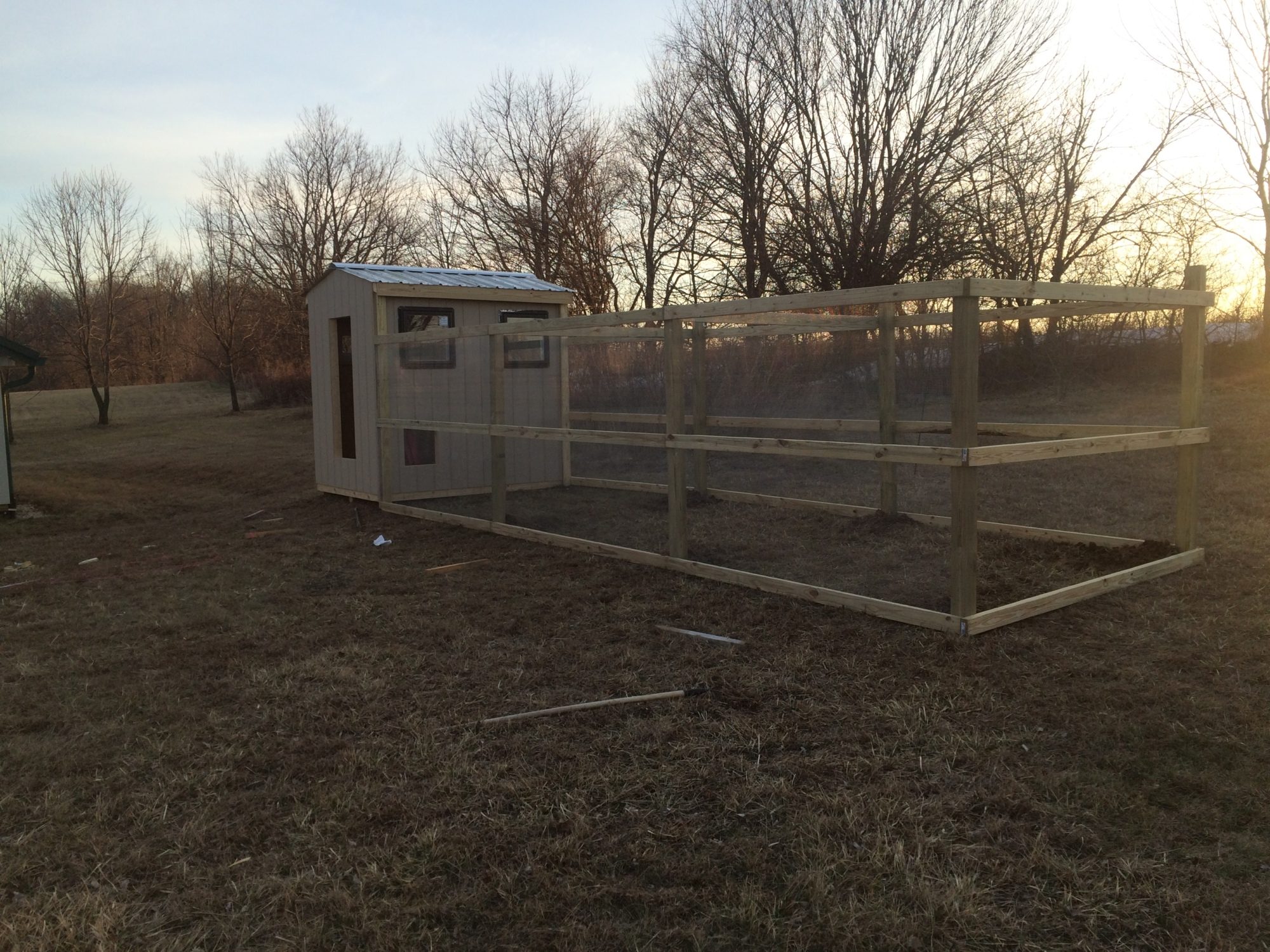 Another decent day and a lot more work done. I have the frame of my run completed and two sides are covered in hardware cloth. I just have it tacked up right now as I still need to add some supports across the top of the run and a few more boards on the side so I can secure it better. The run is 8'x24', I also laid down an apron of welded wire fence 12 inches out all the way around. The one design flaw I found after building the coop was I forgot to lower the two front windows down below 6 feet so I am going to have to angle my hardware cloth up about a foot to get over the top of the windows. I ended up using 8 foot treated 4x4's buried 2 feet in the ground making the run 6 foot tall.