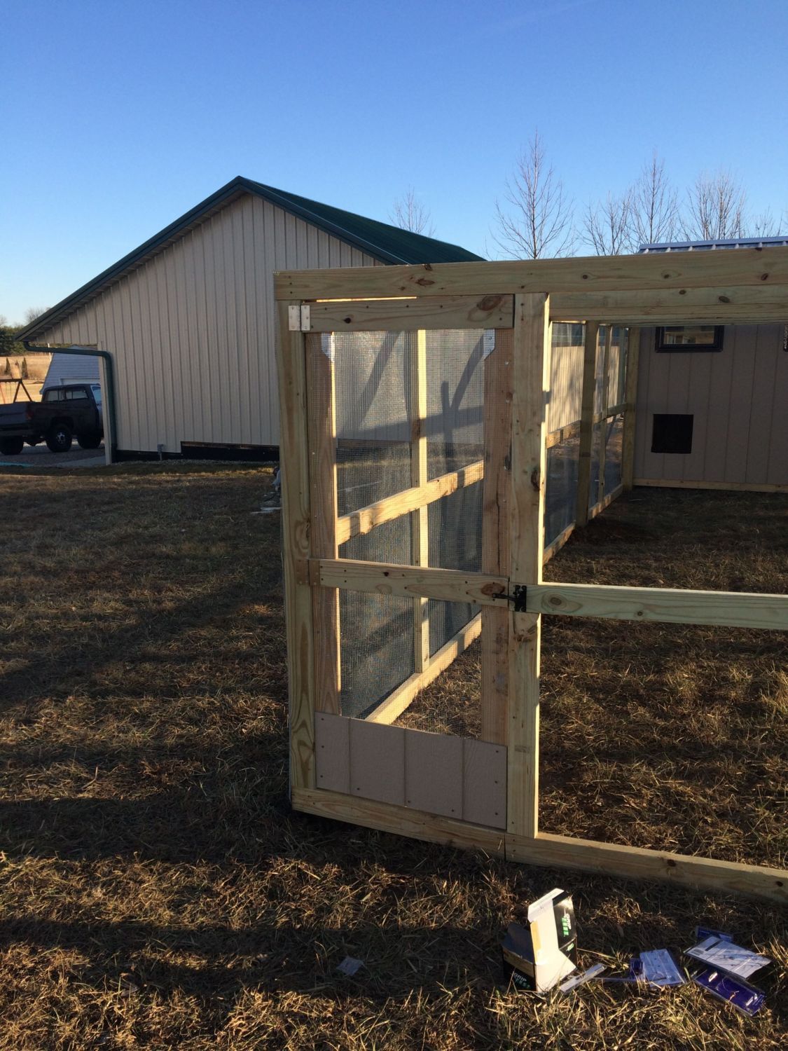 Yesterday it was 60 degrees and sunny, currently it is 30 degrees and snowing, Good ole Indiana winters. Since it was nasty out today I went inside and built my entry door and the door for the back cleanout hatch. Now all I need to do is get the posts for the run and get it up. It looks like the weather is supposed to be nice this weekend so with any luck I can get my run built and will be ready to pick up some birds.