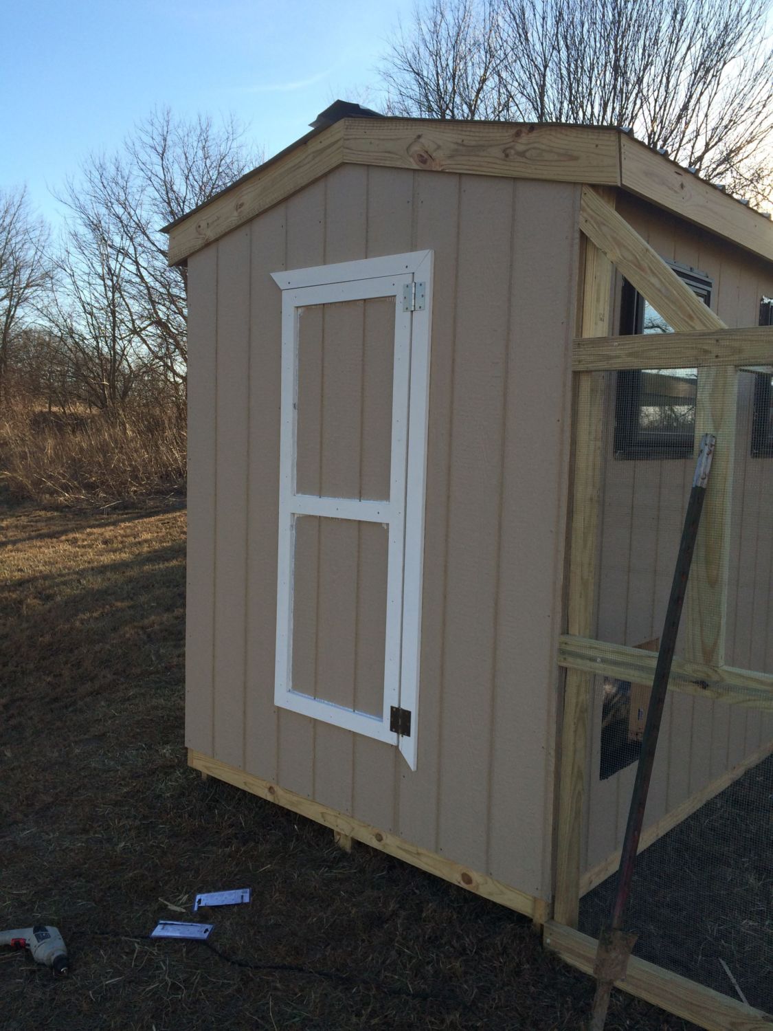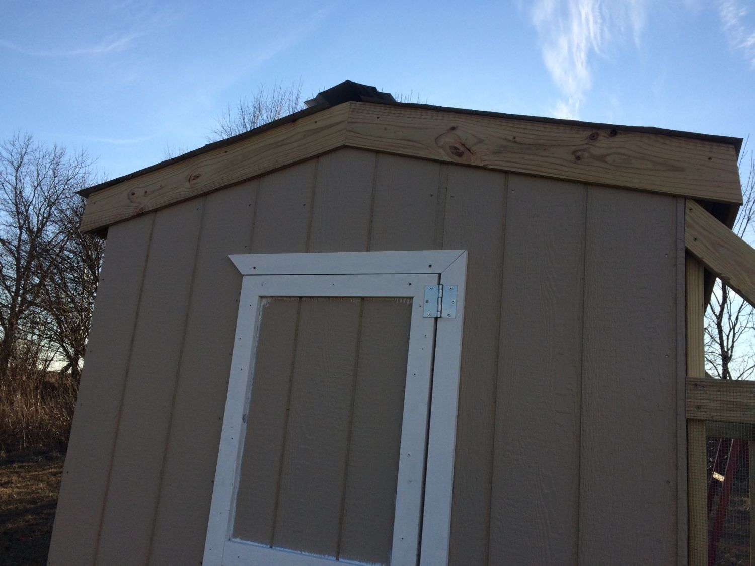 I also got my eave and gable trim up and hung the entry door for my coop. I only hung the top and side trim that the hinges mount to and am still paining the other trim. The only necessity keeping me from chicks at this point is getting the top of the run covered and the nest boxes. I am hoping I can build the nest boxes in one day and get them attached. The outside trim etc I will work on as I get time.