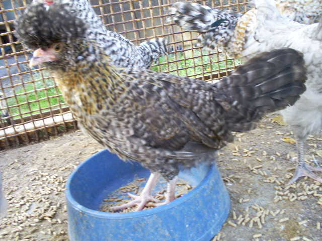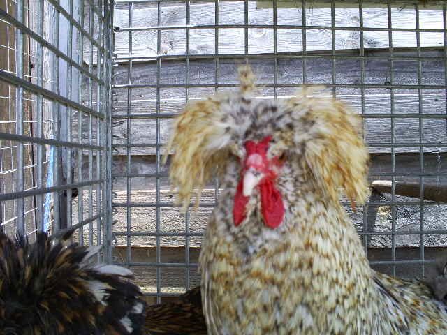 He doesn't have much size or shape to his crest. Plucking isn't to reduce the size of the crest but to eliminate the colored feathers from the white area and the white feathers from the colored front. looking at the amount of color in this bird's crest I would say that he probably is a non-white crested variety or has some w.c. genes showing but not enough to want to take him in that direction as far as broodstock. Would it be possible to post a pic of the top of his head from the back and a picture of the full body? And of the next generation for reference. The amount of gold in him makes me think if you show him to do so as a crele rather than a cuckoo. crele's are not yet a recognized color though due to the huge variation in them. your rooster is also split for bearded and non bearded so you can choose which direction to go.OK...here is a pic of my roo.....he actually looks as if he has been plucked some. I have a son to him with a big crest though which would defiantly have to be plucked! But the one in the pic...I wonder if possibly his crest is too short. It does seem like they are getting longer and fuller in the next generation.