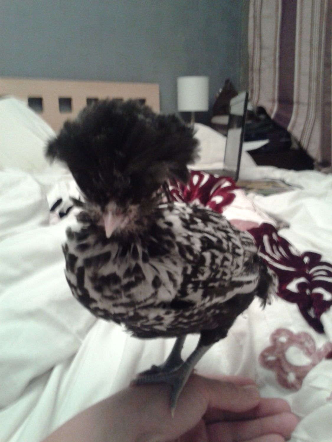 I keep my polish in a mixed group too, my two older frizzle girls are actually top of the pecking order (everyone stays out their way!). They seem to be able to look after themselves well but they are quite stupid and can't see very well cus of their afros (particularly the girls!). I am going to trim feathers around their eyes this weekend after watching one trying to work out how to get around a one metre run for about half an hour! I would wait to introduce them til they are big enough to defend themselves. You don't say if they are bantam or LF but I don't introduce bantams til about 12 - 14 weeks when they are a bit bigger. Maybe introduce them when they are free ranging so the little ones can get away if they want. Also with the Silky are you going to give the chicks to her straight away? If not be prepared that she might attack them if she doesn't see them as her own, she may think they are a threat to her chicks.Have a quick question for everyone. I have a mixed laying flock (well, they are not laying YET, but should be by fall) of different breeds. I have 9 girls and 1 boy, I am planning on adding the pullets of my hatch to this group once they grow out more. My silkie hen will be with them in the grow out pen as she is a good adoptive mommy and is sitting on a few eggs with the same hatch date. Have you had problems integrating polish chickens in to a mixed flock due to the "poof" and that they look different? I have a nice size coop and large run and they free range when the weather is nice and I am home (usually a few days a week and after i get home frome work) would i be better off putting them together with the silkie there to help protect them so they can all get used to each other before the poofs really grow in, or just do the introductions like I did with others using the dog crate in the coop? All of my hens are pretty laid back. My main roo is a Speckled sussex and he can be a bit aggressive with new chickens. he likes to show his authority and keep them all in line.... Just trying to prepare for any possible problems. Any tips or info would be much appreciated.![]()