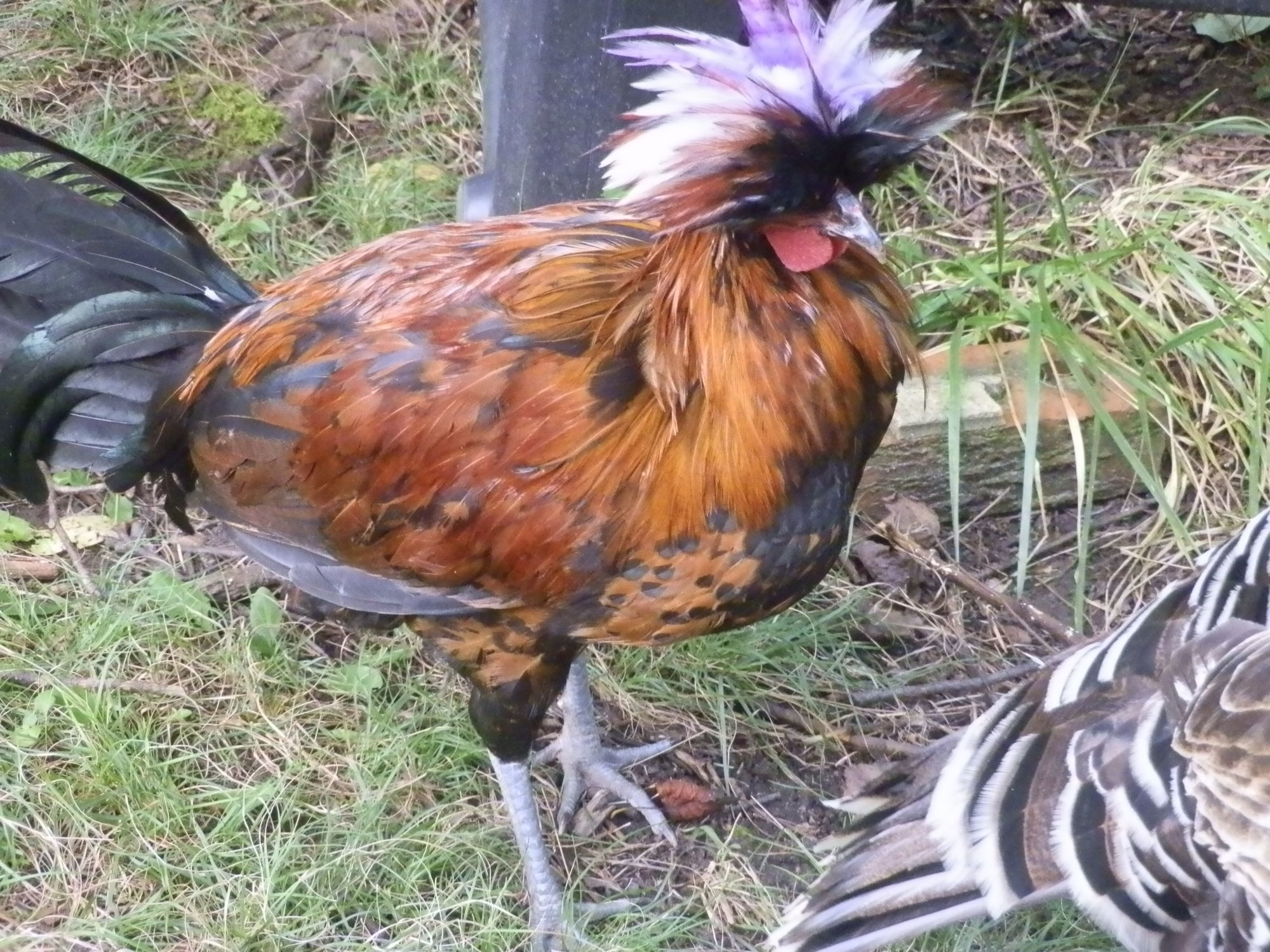 Yes he has purple feathers. I have been trying to keep blue kote on his crest to keep the others from pulling his feathers out. I have always had that problem with him and none of the other Polish I have.