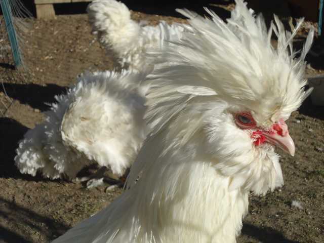 LOL - these are my daughter's new trio. They are Standard bearded whites, and yes they are beautiful! They have definitely stolen my heart...They haven't laid for me since they've been here (only been 2 weeks now) - and I'm told polish are notoriously bad travelers - they take shipping hard, not to mention they were are molting. But this girl Sugar is only doing a mild molt, the other girl the pullet shes got her first season heavy molt, and is full of quills!