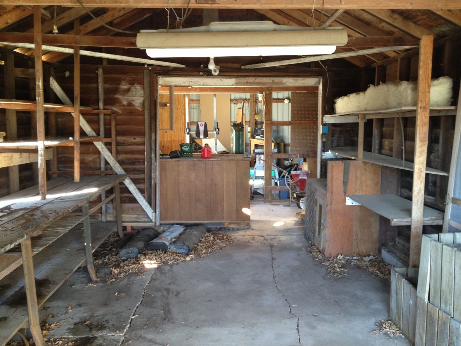 The top is a photo of the area of our shed we are going to be converting into a coop for our 15 chicks. There is a larger shed connected to it in the background. We are going to put up a wall with a door on each side of the coop, so we can still go through this way to the other shed. It measures 14 feet across from left to right in this photo and is much longer the