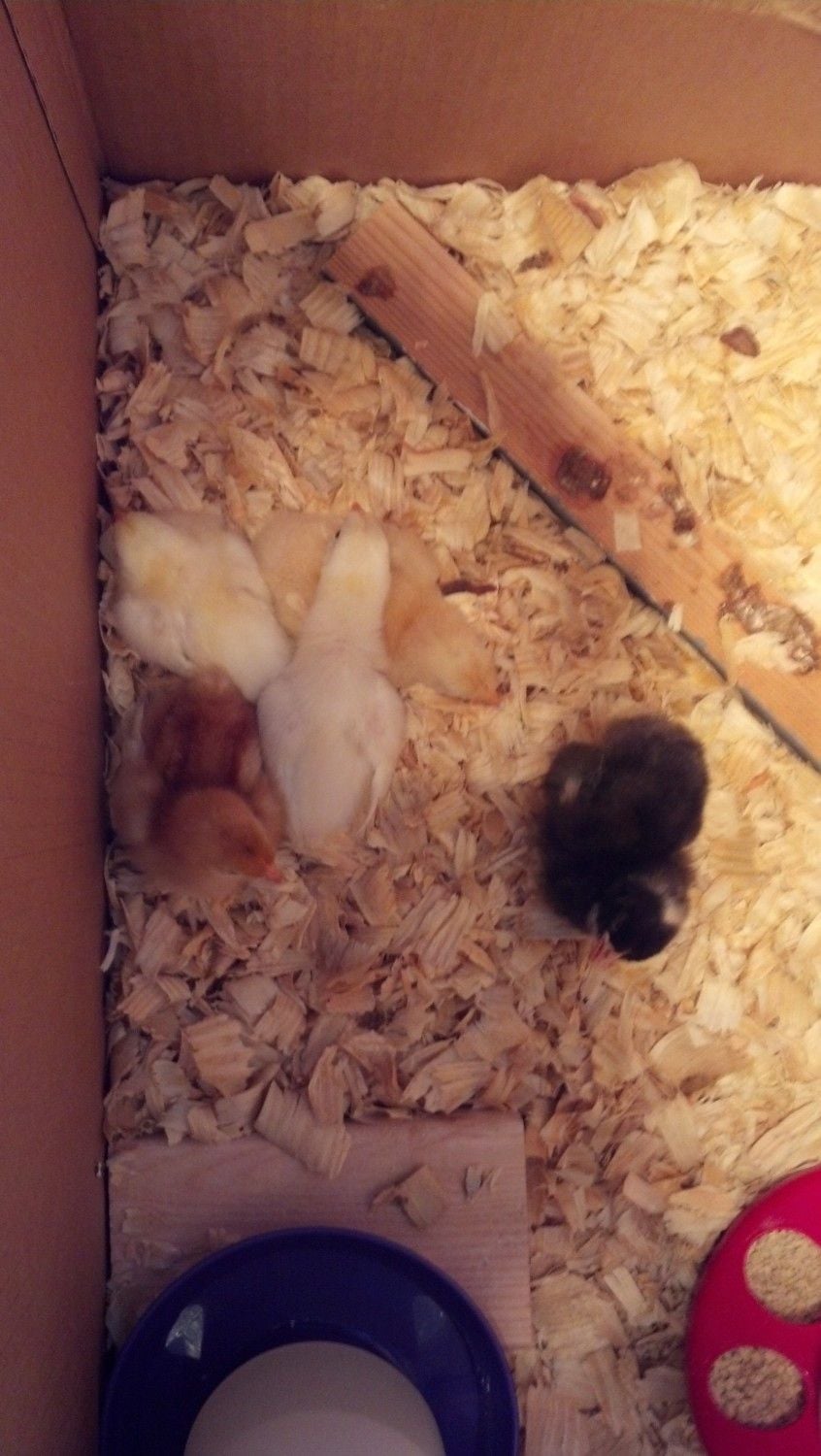 Hi there. I am new to BYC and new to chickens. The coop is under construction, (pictures to come later), and we got our babies on Thursday. I have been reading, reading, reading about how to take care of them, but I have one who may be having trouble. She doesn't have pasty butt yet, no blockage or anything, still eating, drinking, pooping fine. She does have a little dried poo near her vent and I've been noticing her panting... the other chicks are fine though. I've raised the light to cool it off in the brooder box, but I'm beginning to think maybe this one chick is older than the others. I got them at the feed store and we were told they were 3 days old, but who knows, and this particular chick is slightly bigger and and has more feathers on her wings... Does anyone think maybe I should make the brooder box bigger so she can get away from the light more... or even make her her own box? I realize I'm obsessing about this. Also, the chicks are on medicated feed and I am going to get them some grit today...