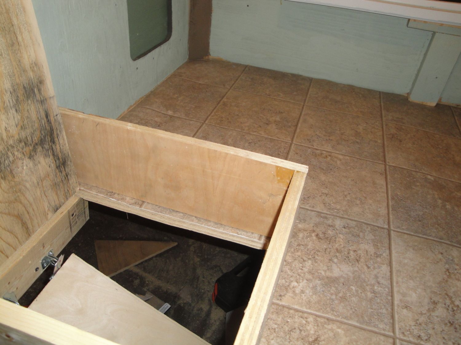 I'm planning a 2x4 with the wide side for them to stand on. (I use 2 x 2's. A little cheaper and perfectly fine.) I'm going to be getting that this week. I love your coop, I think I will do the double doors on the front too, that looks great! And I had never thought of a pop door in the floor, that's a great idea for winter, then they could go under the coop and not have to walk in snow. How does that work? I mean, how do you keep the door from being covered in all the junk? (I inserted a little bit of a lip all the way around, plus a knob for me to pull it up and open it. I keep a small brush right there and simply brush away any errant litter before opening it. The good thing is that it really doesn't matter if litter falls down the hole, since you need litter down there anyway!) Here is a pic that sort of shows it ... I did end up cutting that lip down much further once it was actually put into use.