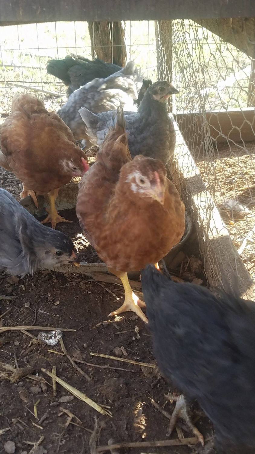 Here we are today with 14 chicken between 8-9 weeks old. I am trying to sex them because I found a home for some of them. I am pretty sure about a few, but need a little help guessing. Because these were an accident they are mix breed. Daddy was either a Marans or Olive Egger. Mom's vary---Australorp, EE, OE, RIR, JG, Dominique, Marans