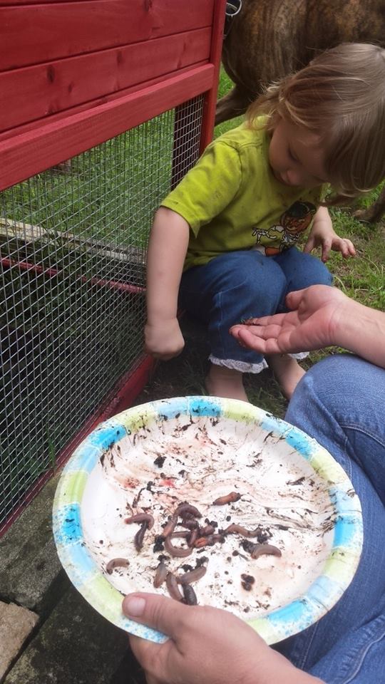 I thought it was a neat idea to feed my babies worms. As you can see I cut them up so they would be able to eat them. Picture is of my granddaughter feeding them. Now when I go over to her house she says, "Worms, chickens Nanny". Meaning she wants to go feed them.