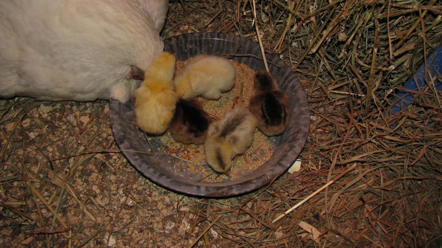 I've got chicks, I've got chicks!! Five little fuzzy bums (one smaller pullet egg didn't hatch, looks like it quit around 10-11 days). Here is a pic of all five in the feed dish with the mealworms Krystal is trying to get them eat. I love watching them!!