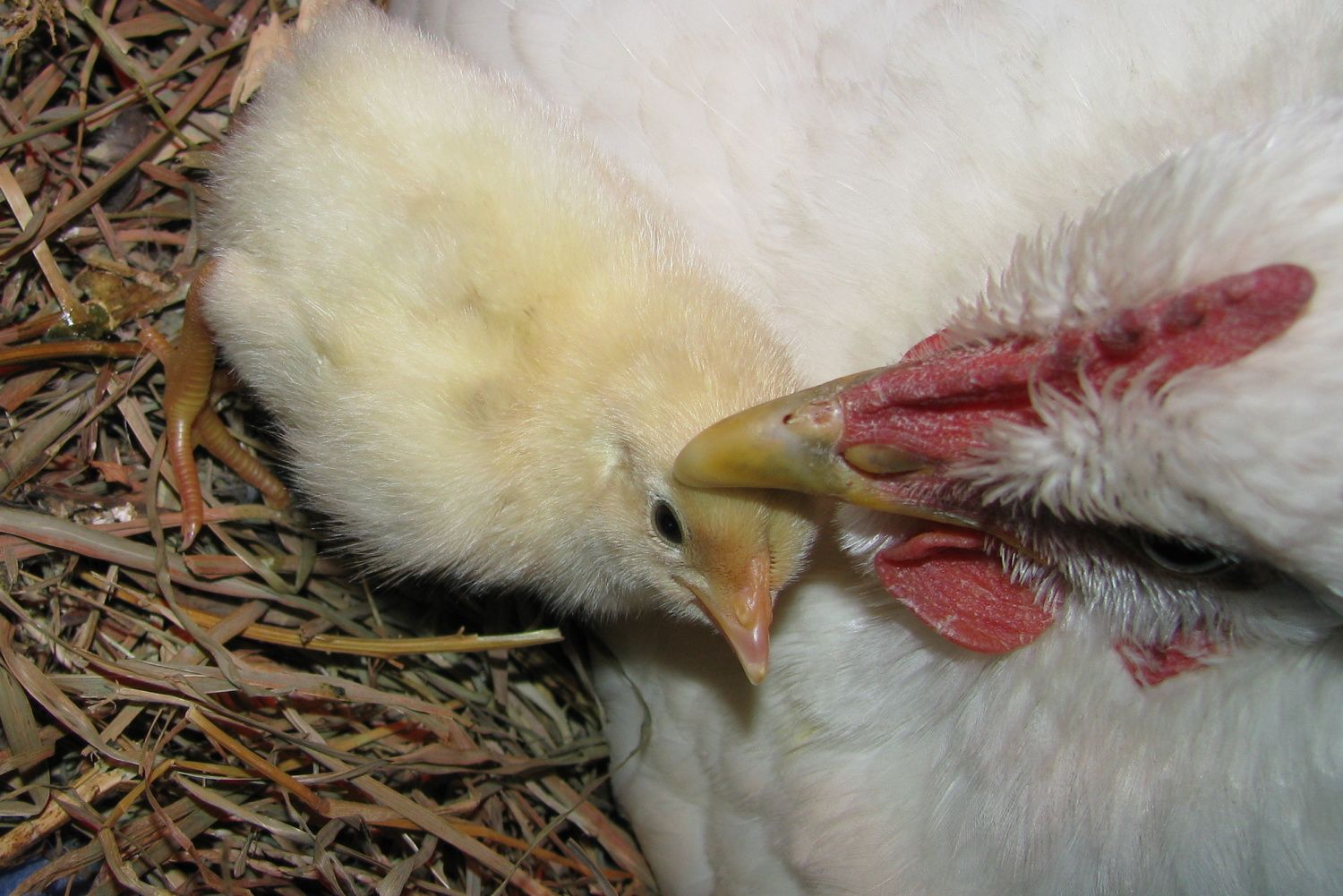 It was trying to get as close to Momma as possible without hiding under her! So curious, but still cautious.... Krystal just "talked to it" and tucked her head down, as though she was reassuring it that it was okay! I'm going out now to close everything up......I will, of course, be checking in on them!