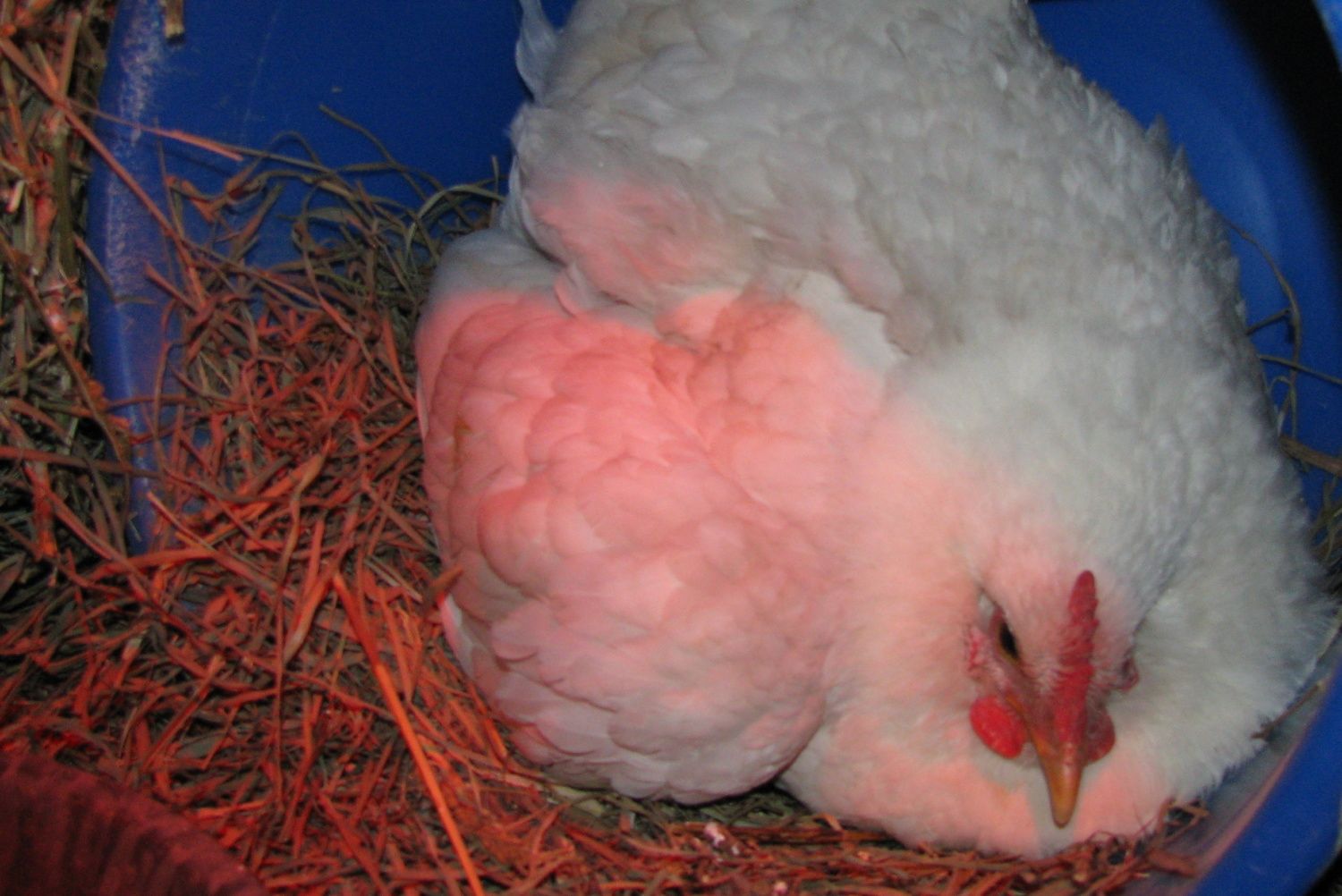 This first pic is her in the bucket nest before chicks......the second is the one I just took, you can tell she's hiding something under that wing!