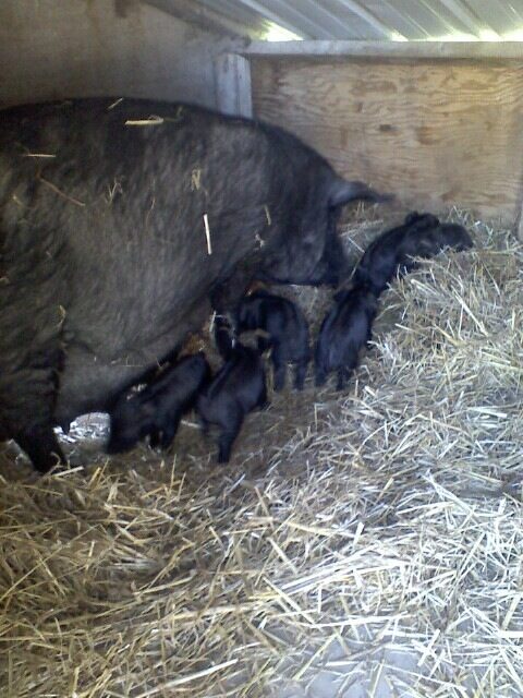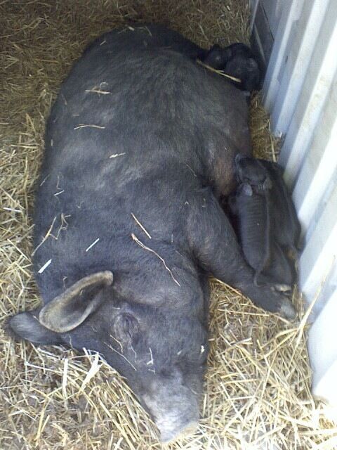 2 of our American Guinea hog sows gave birth last night! :ep I watched the first sow give birth to 6 piglets last night, but this morning my sister ran from the hog pen saying that the other sow had given birth to 6 piglets too! I knew that she was close but not that close!