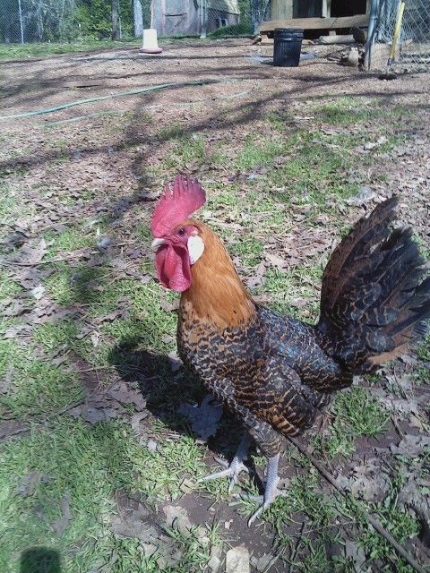 five hens and two roosters, both roosters RC, with crests and BBRedwings, one has feathered legs and normal other featherings, one hen is self blue, one black with gold lacing on cape, 3 wheatens, 4 are RCs and one half RC and half Straight. All are gentle.