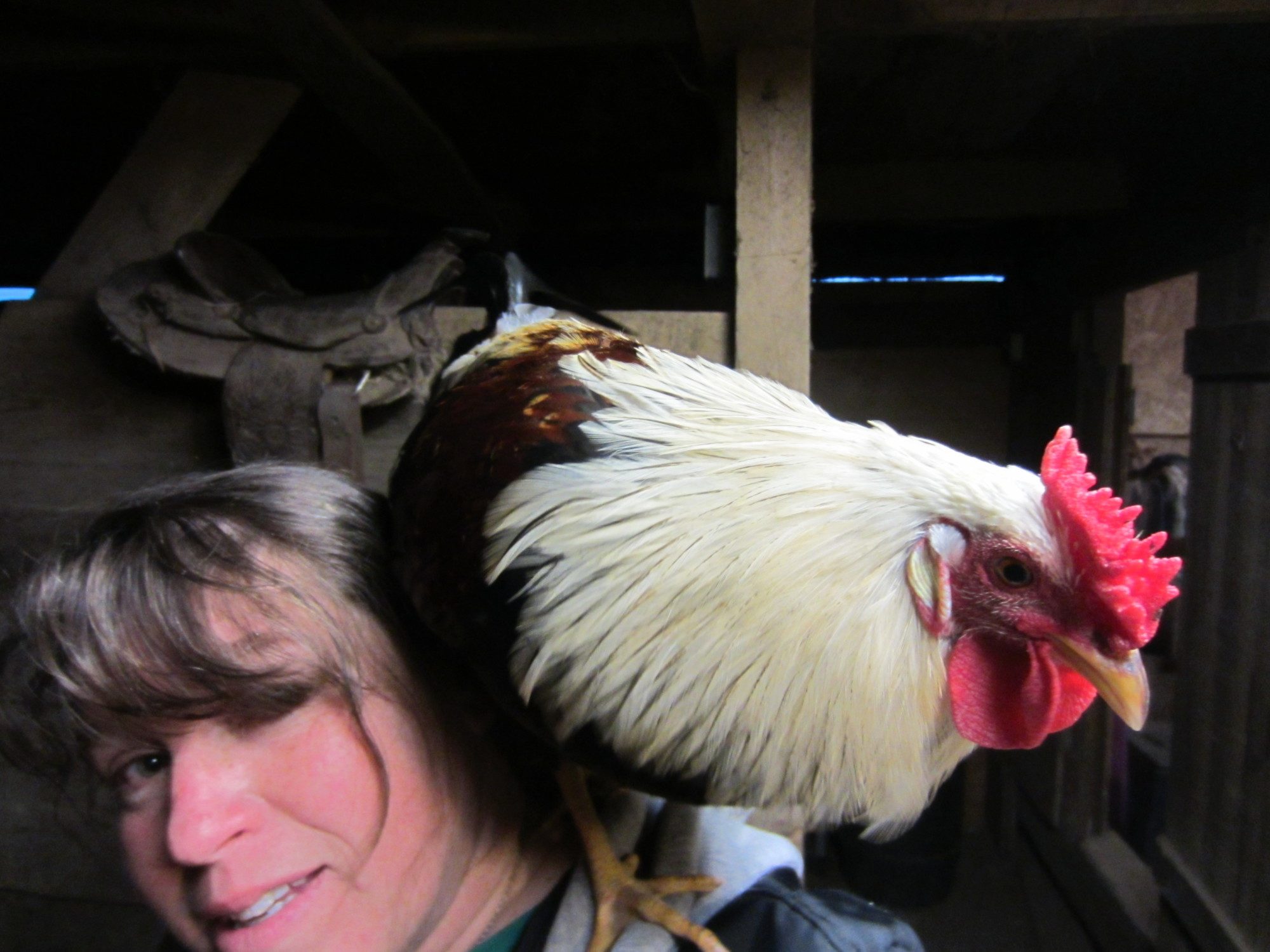 Cowboy, my favorite friend this spring, liked to ride on my shoulder at chore time.,Sadly he refused to go in the coop at a very early age, preferring to roost in the rafters where I couldn't reach him. I assume the coons got him.
