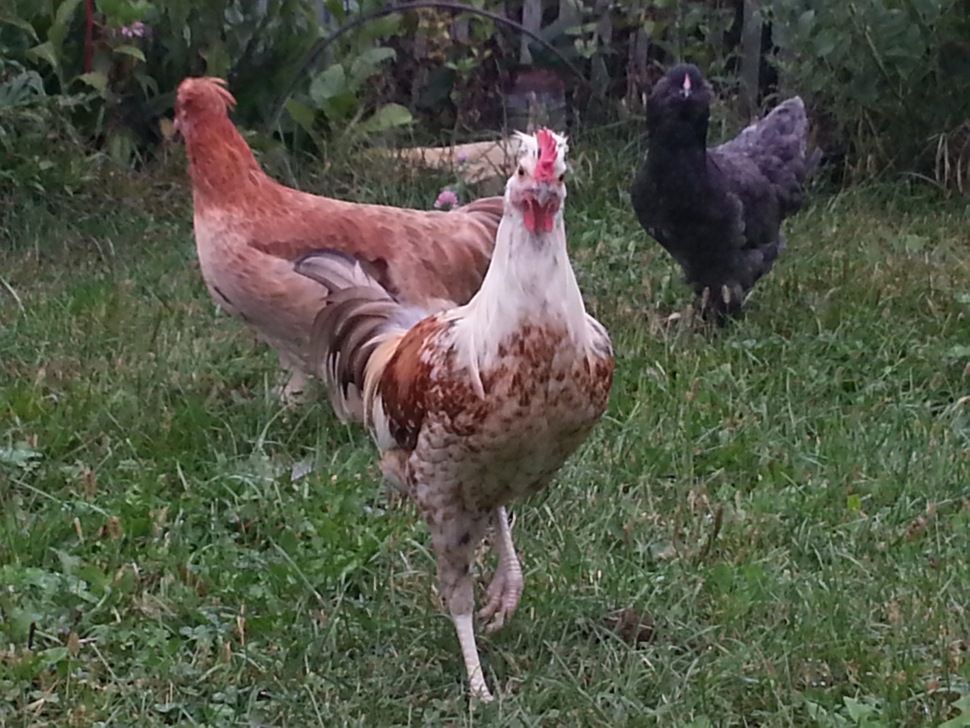 I have some unidentified birds, and a rose comb brown leghorn.