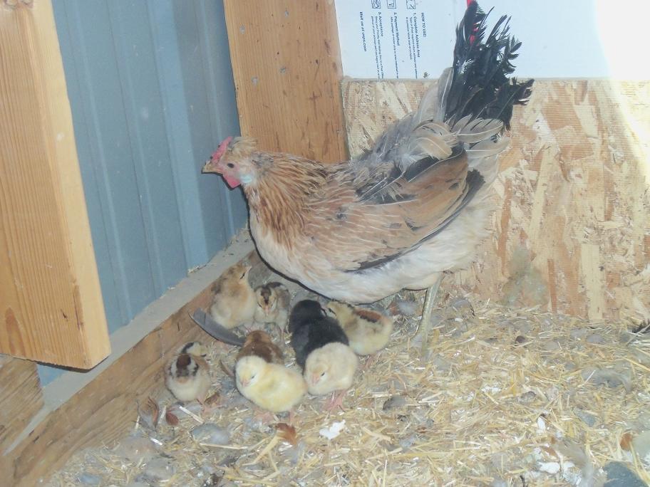 And one of my broody minding her babies, Svenson and Hveiti. One cockerel, one pullet. Both from my hen "Psycho".