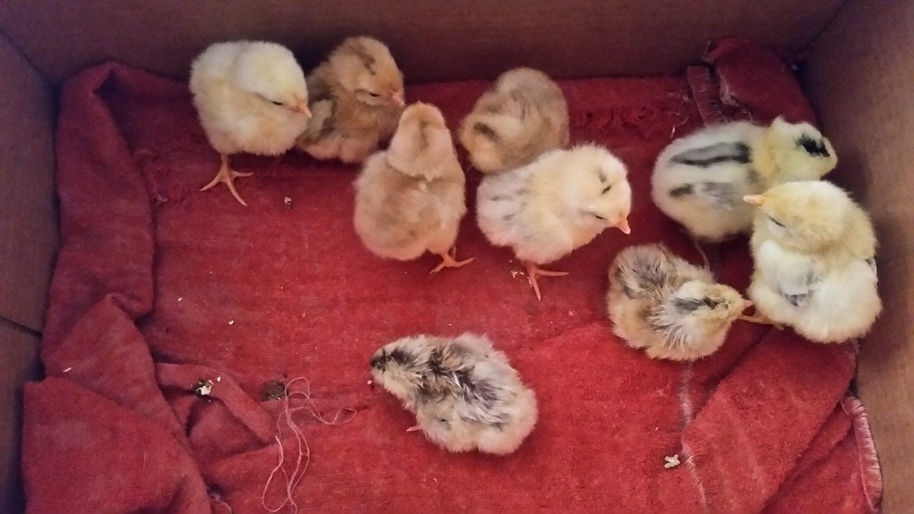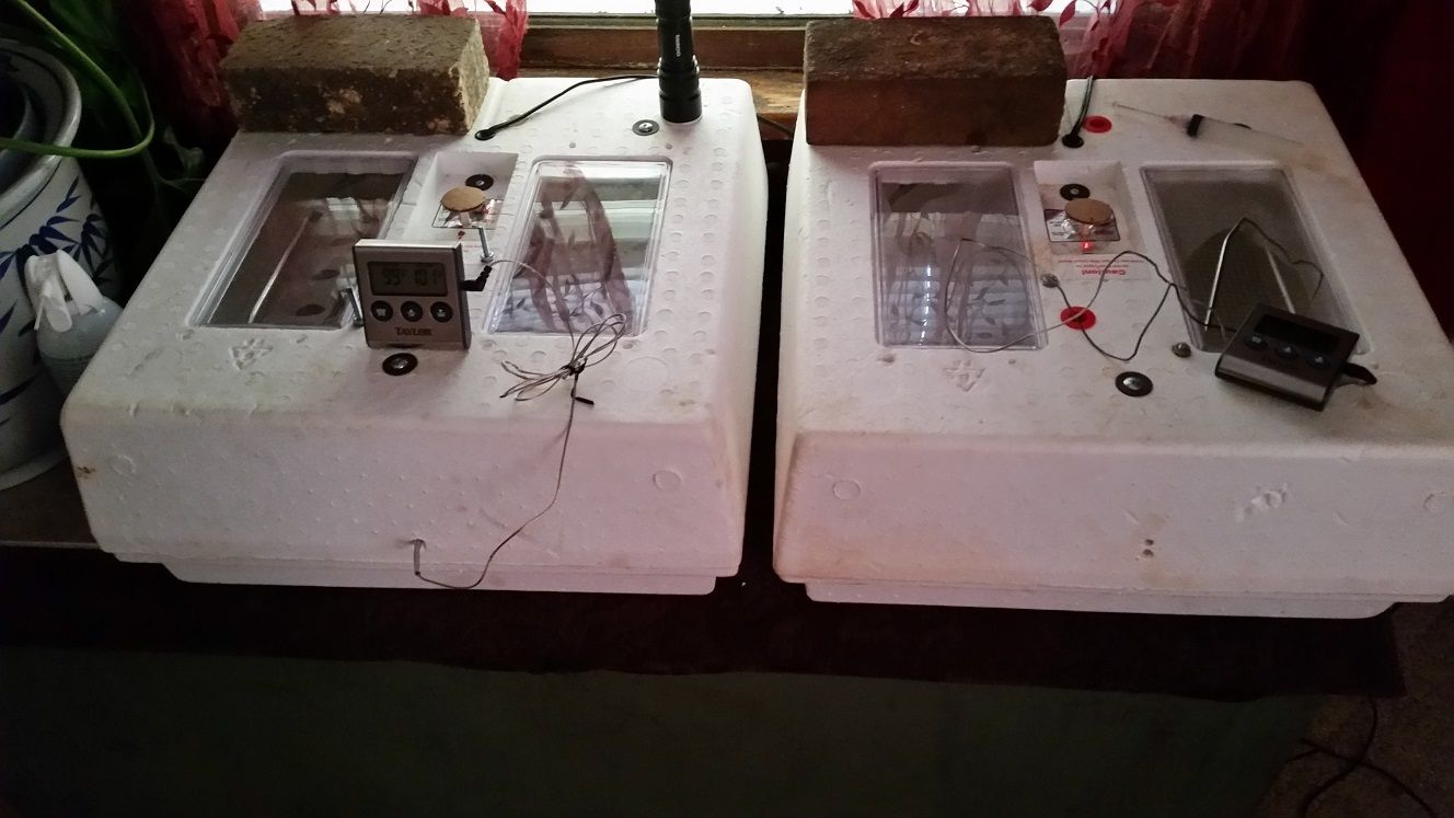 Here is my Icelandic Saga if you will. First off I haven't made a post in years. There are a number of reasons for this the main one being that a little over two years ago I lost most of my birds in one night to a weasel. I killed the weasel, but lost all my EEs including my rooster. Kind of took the wind out of my sails. I was left with one Buff Orpington and three EE/BO cross hens. Enough to supply my wife and I with eggs. This last fall I told a friend at work that I was thinking of getting a new rooster. About a week later he told me of a women on Facebook giving away an Icelandic cockerel because her other Icelandic cockerel was beating him up. Not knowing anything about the breed other than they were somewhat rare I looked them up and after reading a little bit I knew I wanted him. The lady I got him from said I should start my own flock. Her small flock was out of the David Grote flock. A month ago I contact her again and asked if she was willing to sell me a dozen eggs. She agreed and when I picked them up I discovered that she had started them in her incubator as they had been laid. This meant that I would have a week long staggered hatch hatching from one to three eggs a day. She had dated each egg so that was helpful. I set up two incubators; one with a fan and egg turner and the other with just a fan. Kept the humidity around 30-35% in incubator #1 and 60-70% in incubator #2. Since installing the computer fans in the incubators I find keeping the temp in the LG incubators at 99.5 relatively easy, but they are in my bedroom with a very stable temp. I candled each day and as they got close to their internal pip I then would moved them to incubator #2 to hatch. They all hatched on day 23 due to being transported 20 miles and cooling a bit. Out of 12 eggs I hatched 10 chicks. Considering what they had been through I'm beyond happy about it. These are tough little birds. Guess I'm back in the game now. BTW..I picked up another dozen eggs which she didn't incubate and I'm starting them today. They should hatch around 6th of June. Here are some pictures. Only have 9 chicks in the pics due to one still being in the incubator drying off. I keep a brick on the incubators since we have cats.