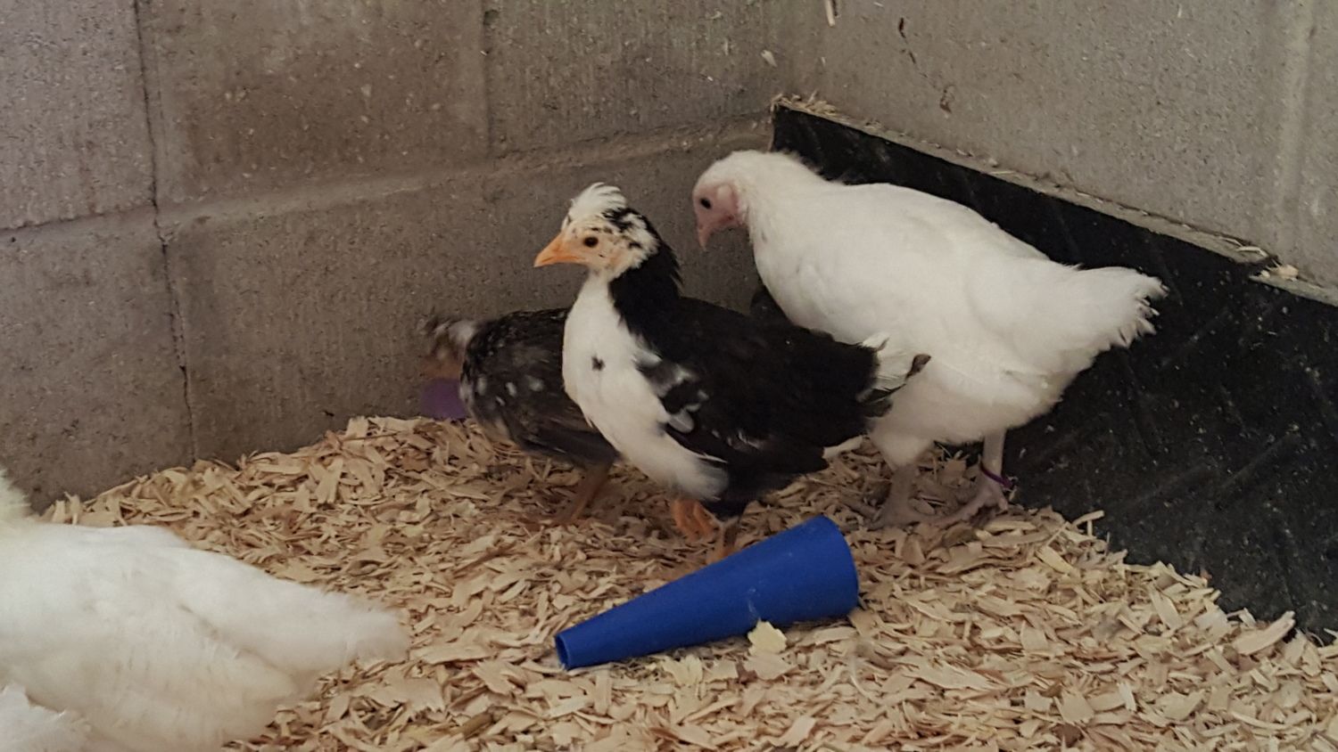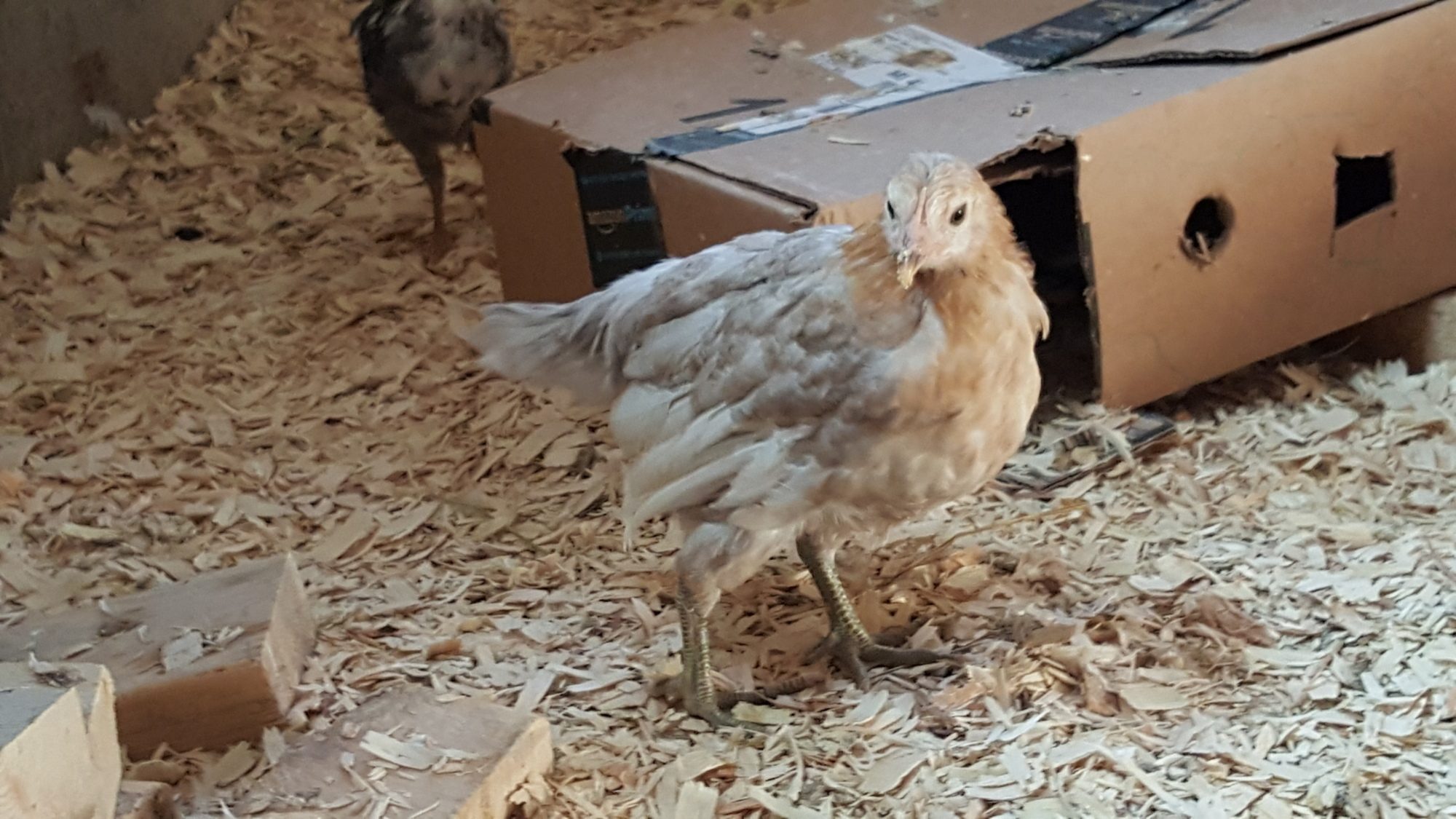 The chick in the picture above could turn out like my Gula (on the right) You can see her body color is not white (compare to Audun's tail), it is more a dusty gray/blue or lavanderish color. She has gold around her neck and some color in her breast.A couple pics from the babies that are about a month oldThey are in with my white bresse, so that's what the bigger white birds are. Never mind the chicken toys either, I have a 6yr old that keeps all birds entertained!