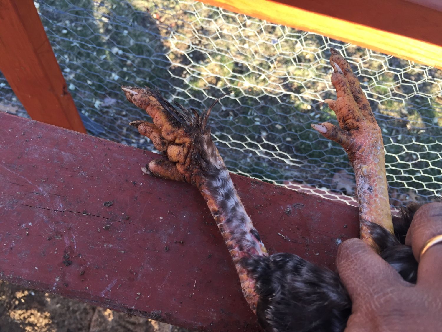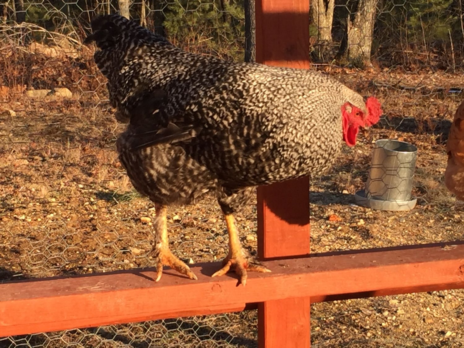 My goodness, his feet look terrible. Does he have scaly leg mites. They badly need treatment. Doesn't look like he stands on them well. He is not a BR he doesn't have yellow legs, and BR's don't have feathered legs. Though I can't see any feathering on him.