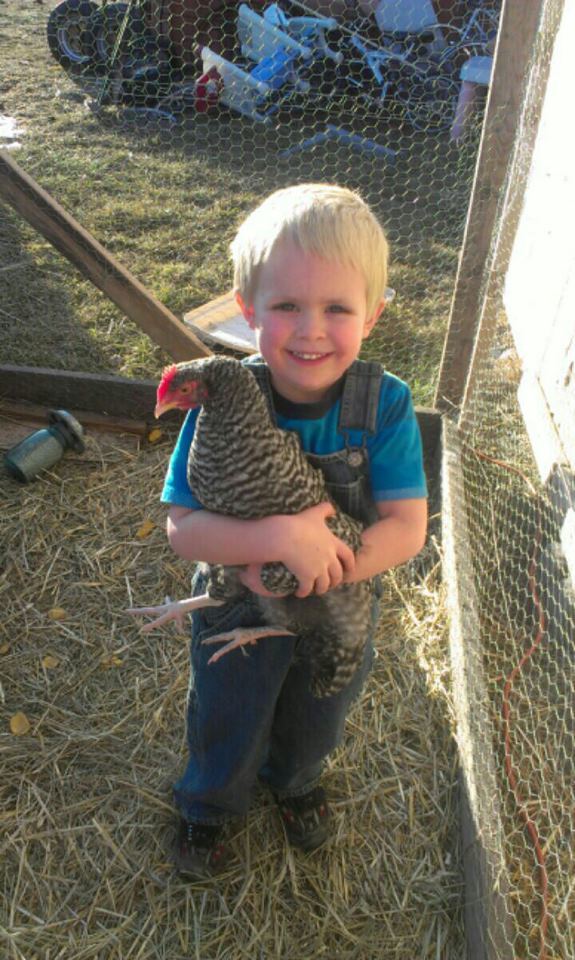 This is my great-nephew holding Aragorn, only took me about 3 weeks to get him to let anyone hold him. Ethan comes over on the weekends and loves to help me with the chicken chores and was so tickled that he was able to pick one of the chickens up, but I can't take credit for the picture because his dad took it when they (his mom and dad) came in to pick him up today.