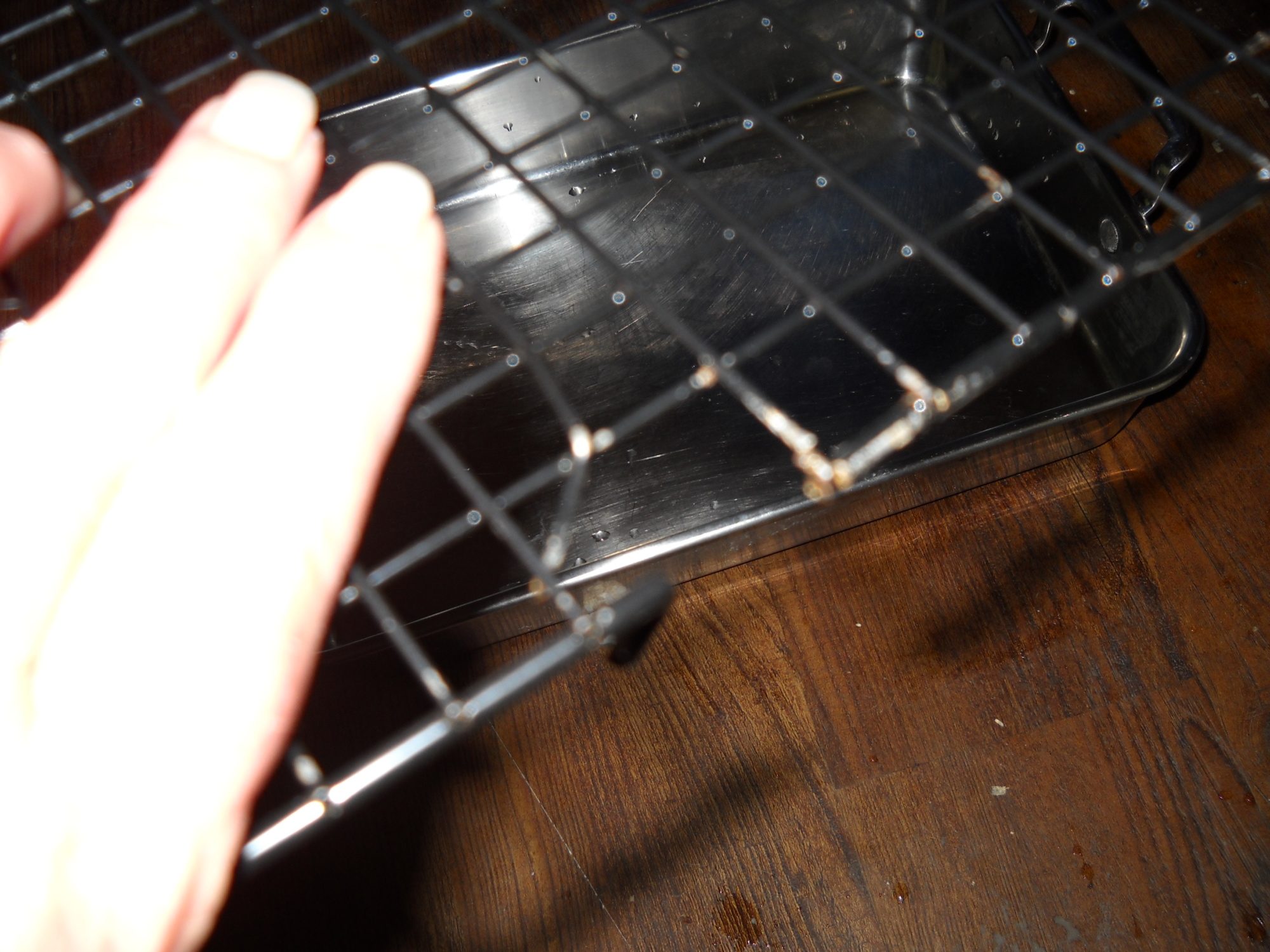 Tried to get some pics of the cake rack last night. Didn't come out well but if you look hard you can make out what we did. The only reason I needed to do this at all is the handles on the roasting pan. I wanted an easy way to remove the pan when it did it's job and collected the water the ducks would normaly have spread around.