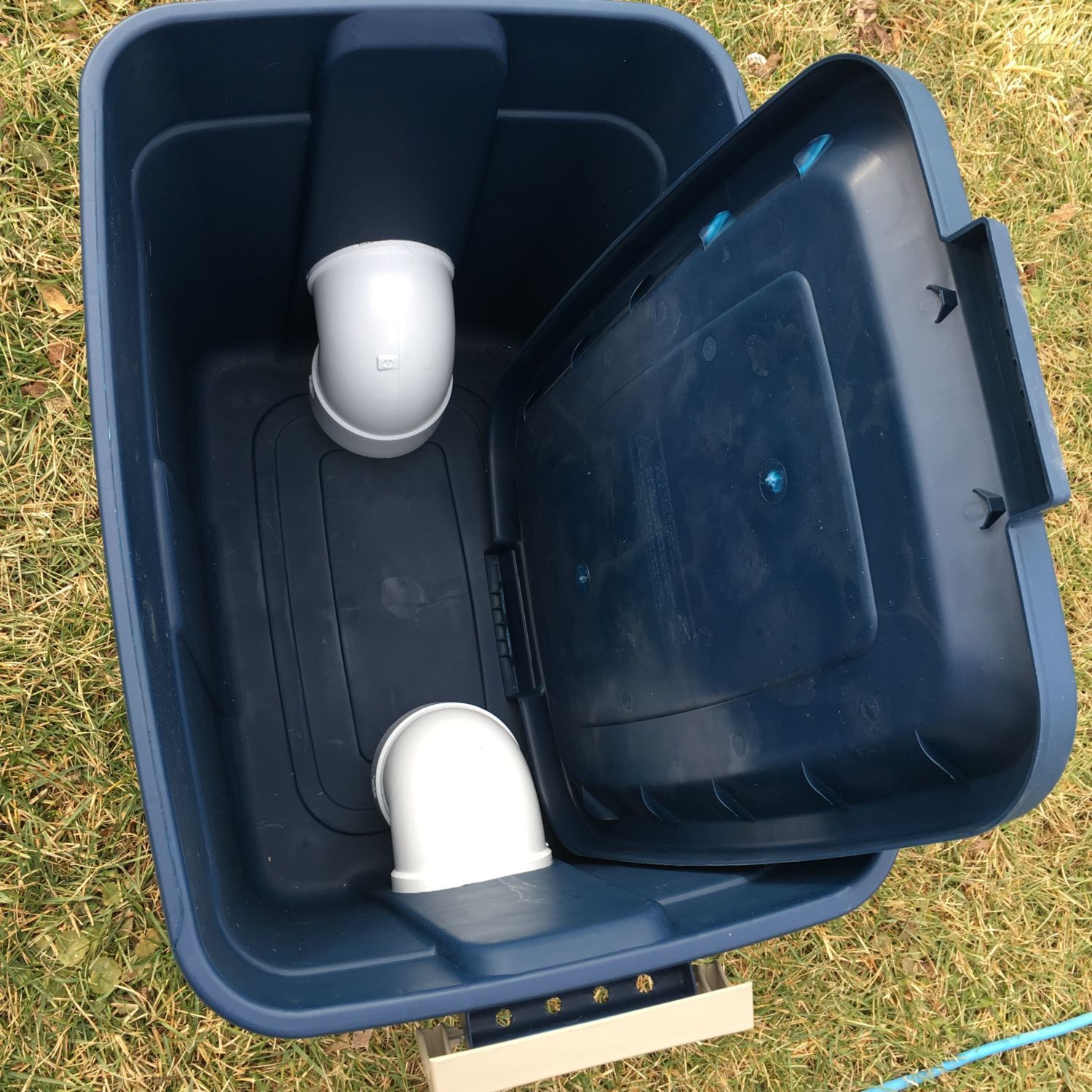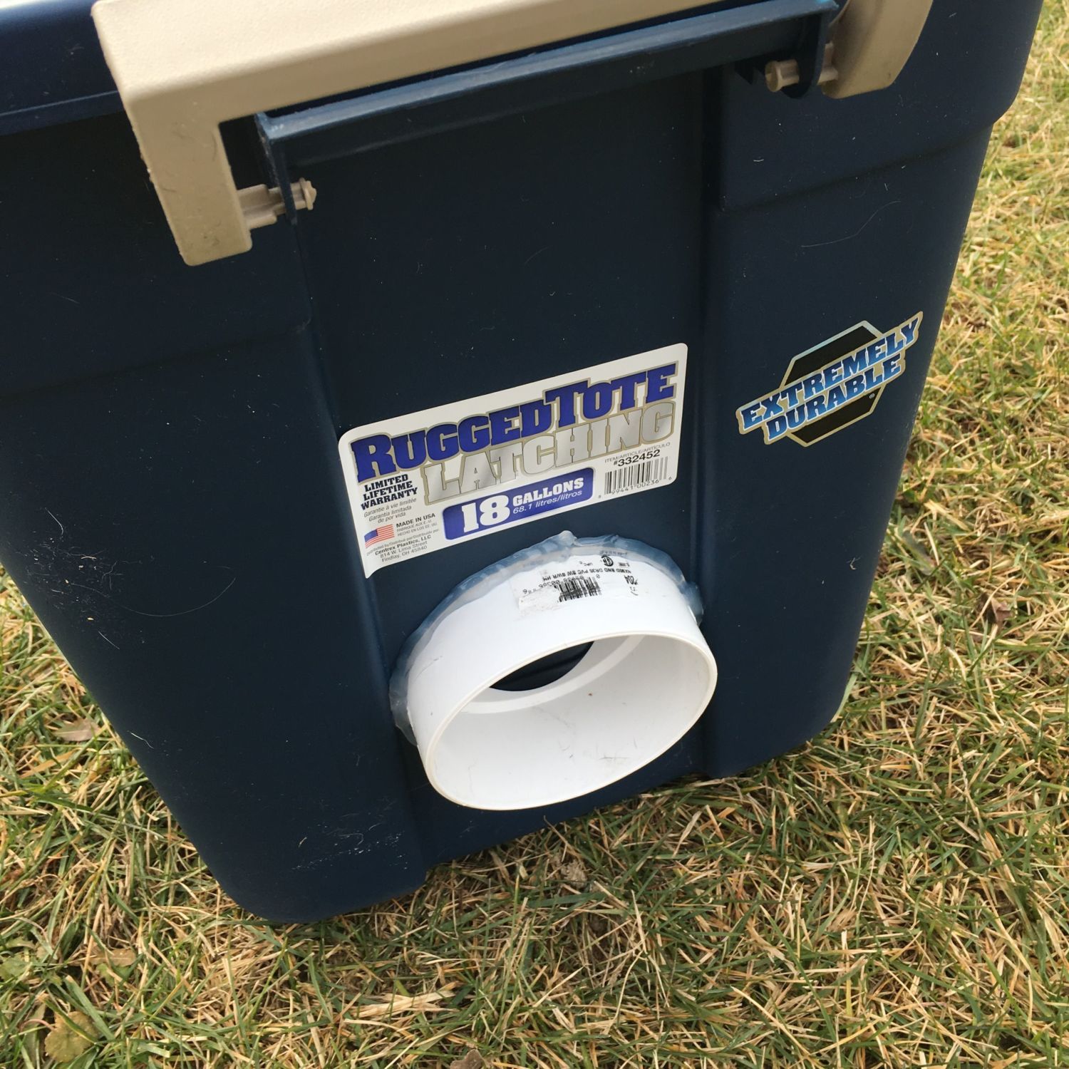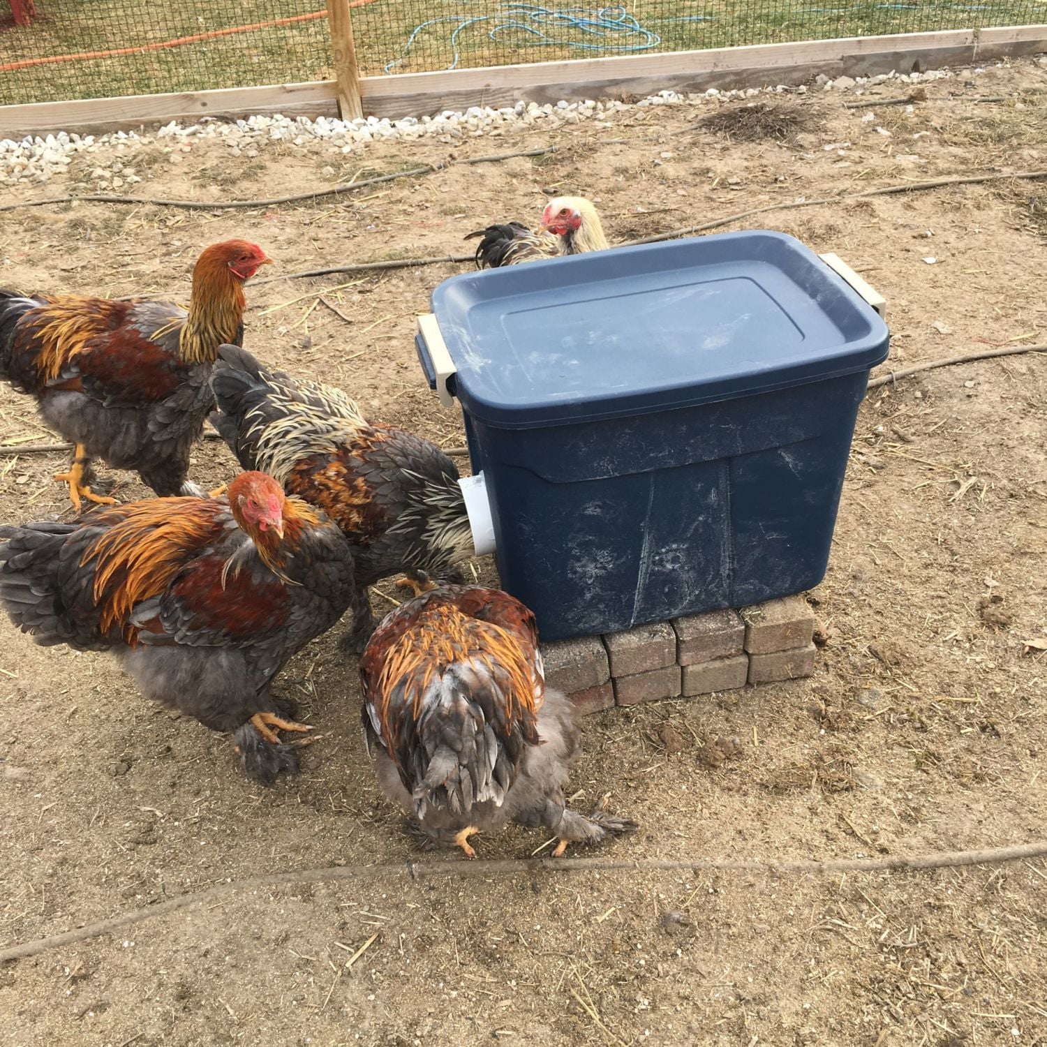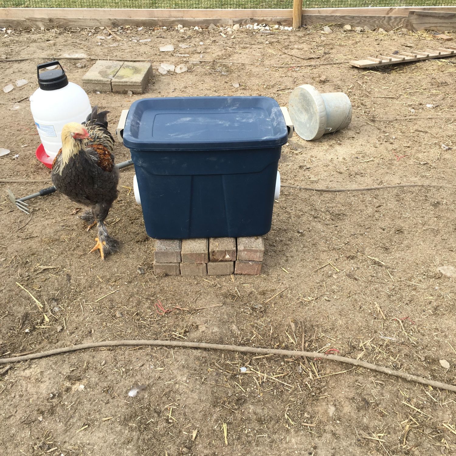 The Feeder. This is based on a concept already being sold in 5 gal. bucket form. I decided to take the 5 gal. bucket idea and turn it into a 13 gal Tote. The less I need to do daily to feed and water the birds, the better.