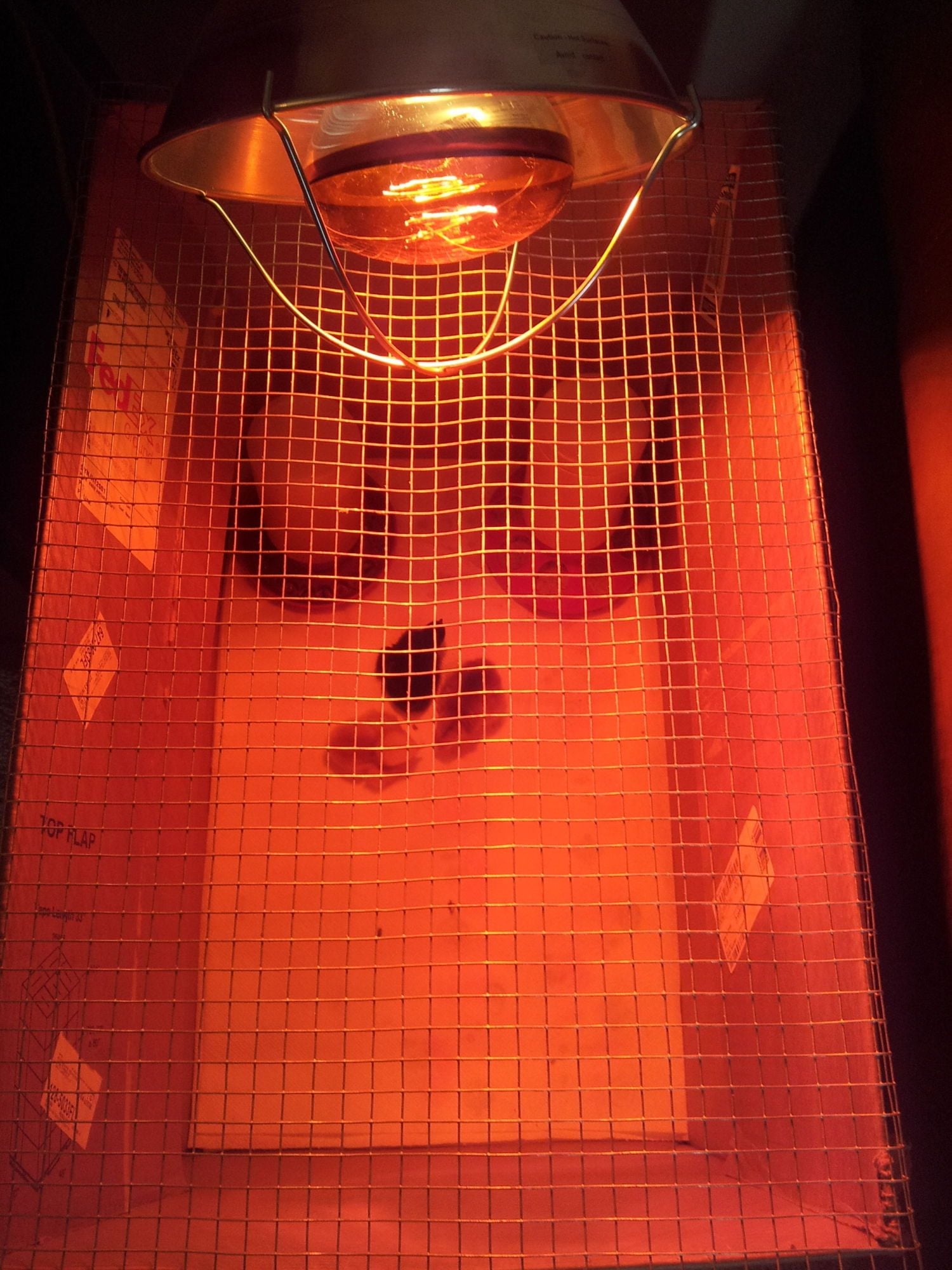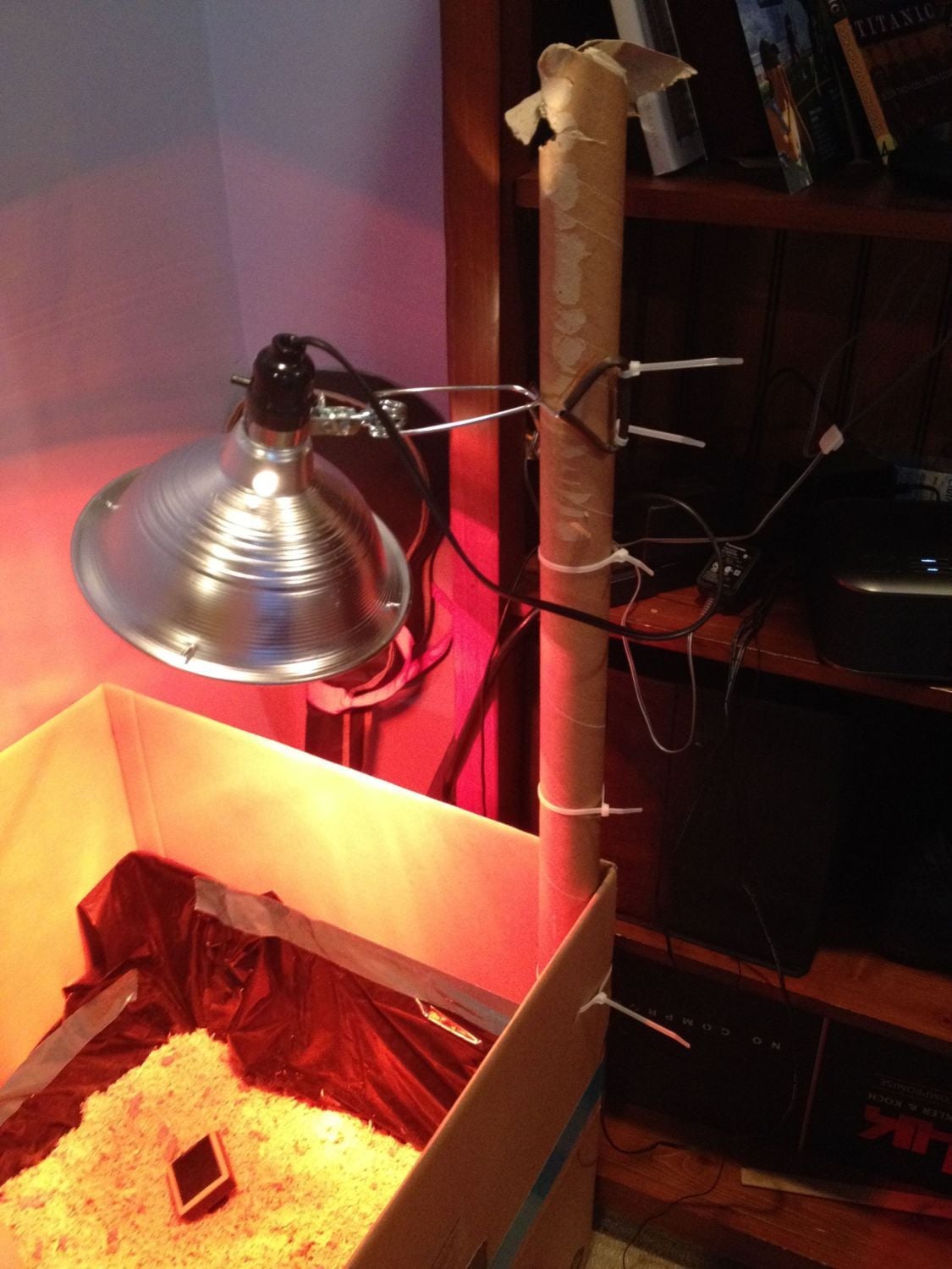 Hi! I need to suspend my lamp over one end of my rectangular brooder. The clamp clamped to the side makes the lamp point at an angle and heats the whole brooder. Ideas on how to suspend the lamp other than drilling a hole in my ceiling for a hook? Thanks.