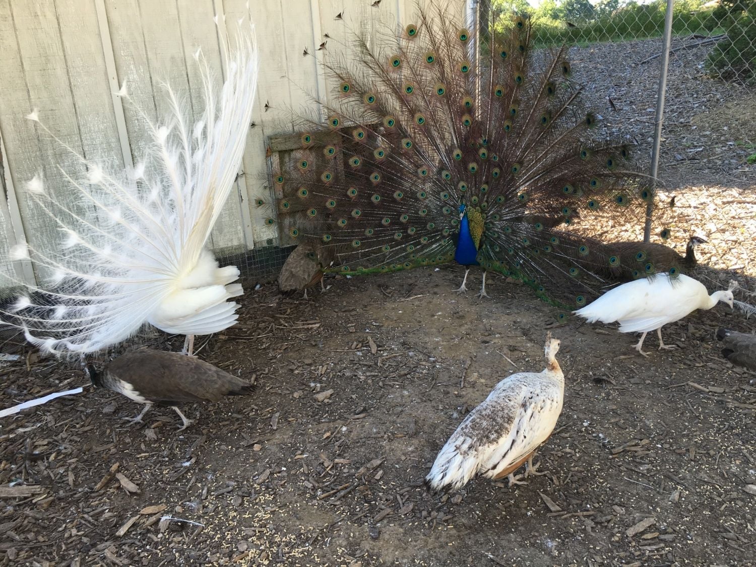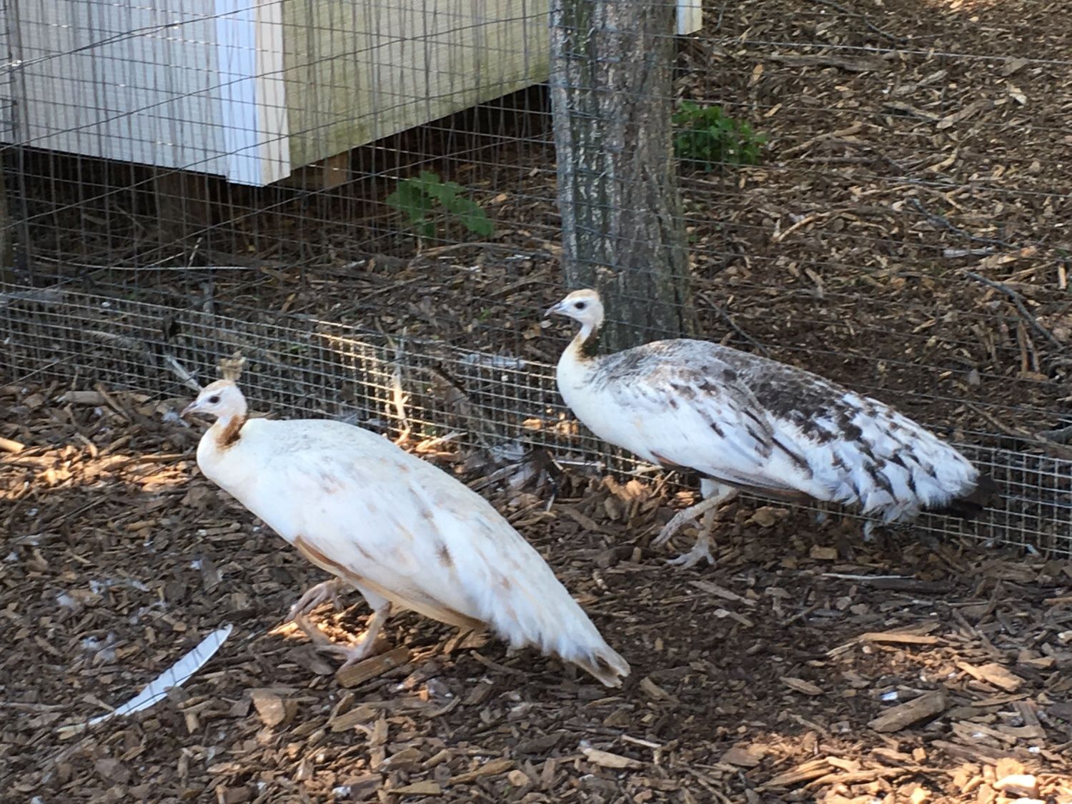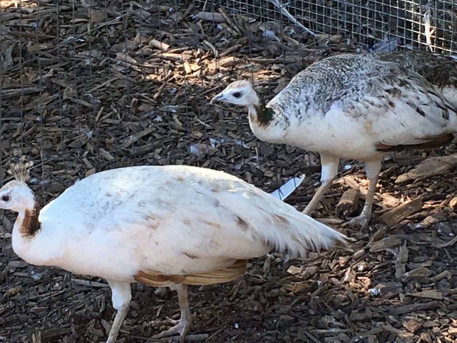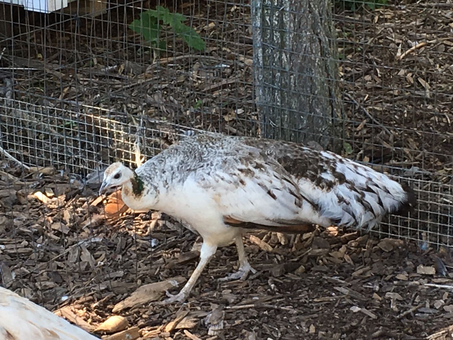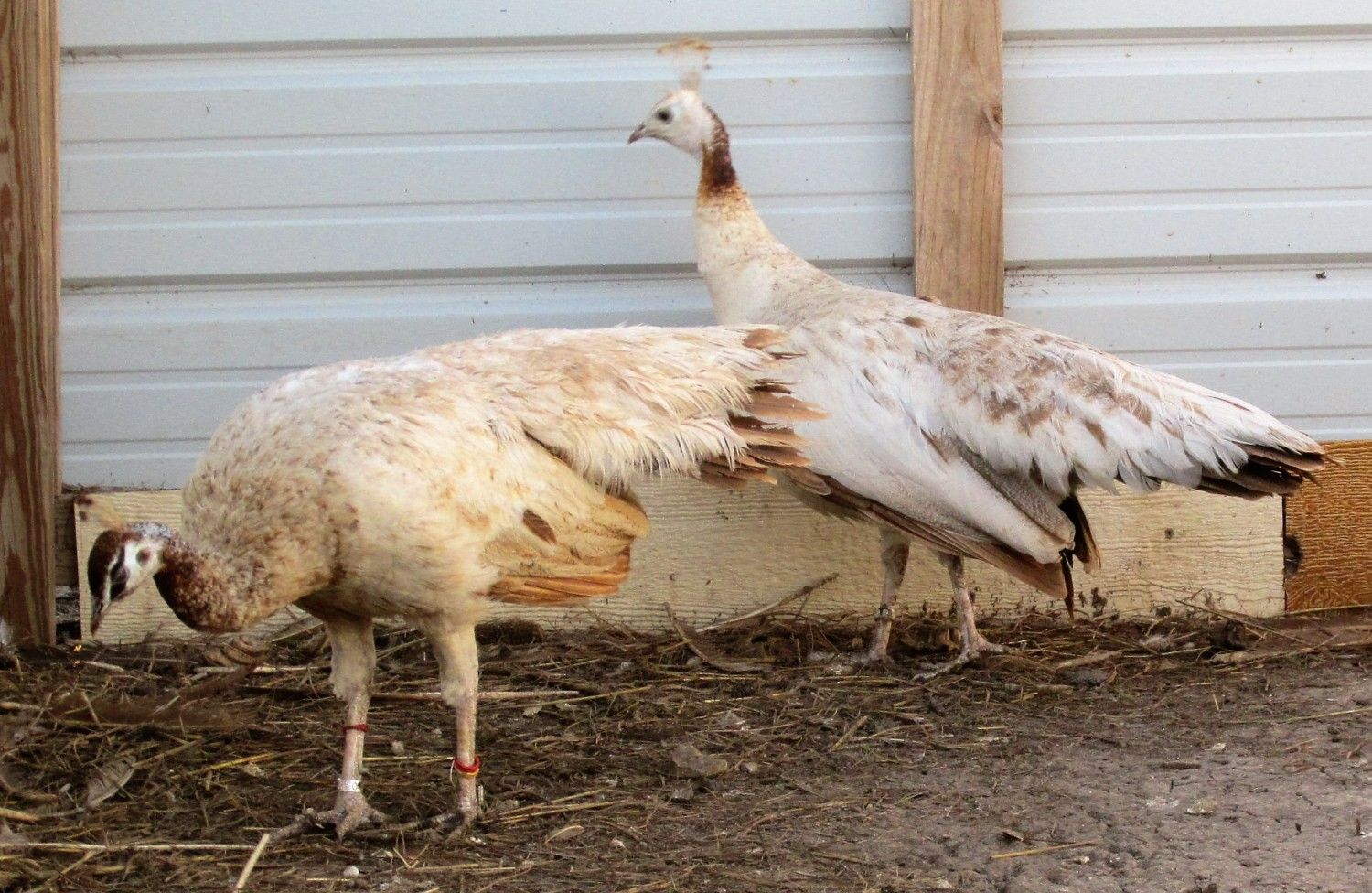 Anyway, when I got home I noticed that the larger, suspected mother is darker than a normal BS peahen and the smaller, suspected daughter is MUCH lighter than a normal BS peahen. The lighter bird is definitely a different color and the darker one might be, but because pictures of peahens are less common than pictures of peacocks I have had a hard time identifying them. If you guys have any idea what color they are I would greatly appreciate it.