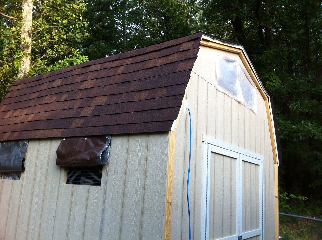 and congrats on the new chickens! What type of shed wood? All of my coops have windows that hinge on the top so, they lift up/open by a pully from outside the run. I put j-channel on top of the windows so they don't leak and because they swing up - most times they can be open and rain will not get in. They are covered with alum. screen and hardware cloth on the inside and can be locked shut from the inside too. Vents are on both side walls under the drip-edge