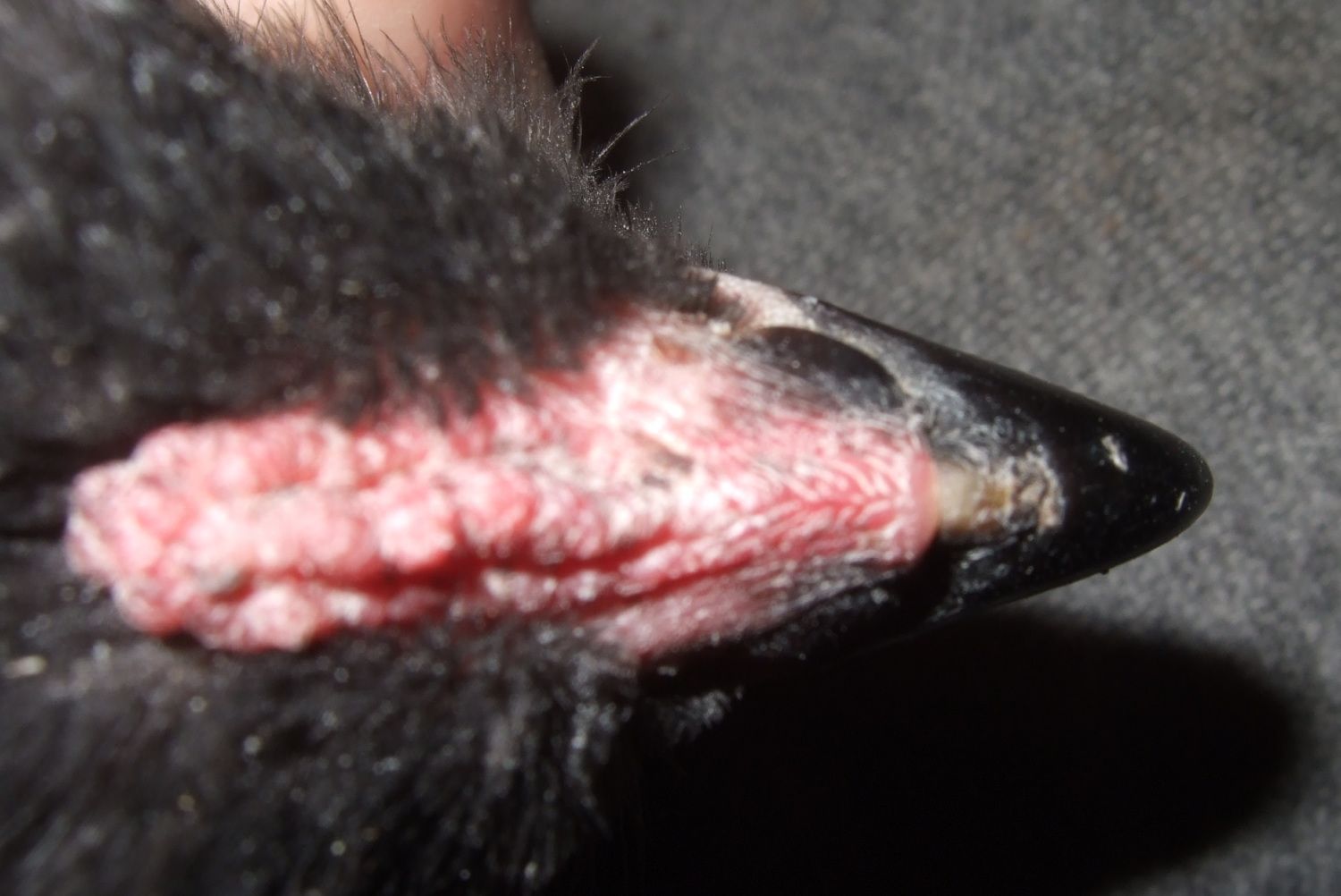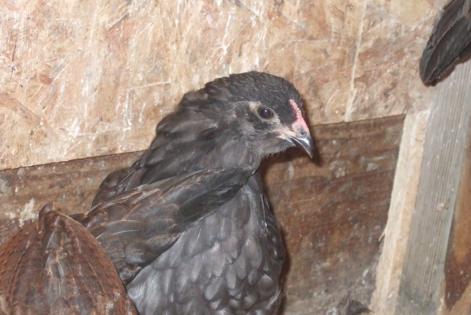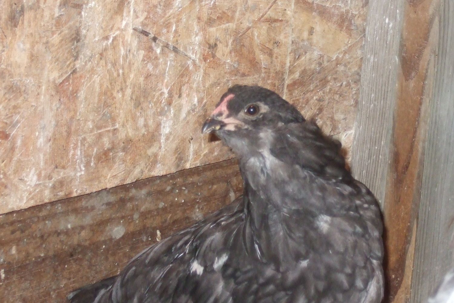Okay, I sent some pics to Jim Heinz, who I got the eggs from, and he agrees with me that she is a she! One row on her comb, no pointy hackle or saddle feathers and demeanor is very pulletish (is that a word?). Her egg came from a pen of Ameraucanas with a black rooster, two splash hens and one blue hen. She is blue with a few white feathers. Jim says the white may disappear by the time she has her adult plumage. Not much in the muffs and beard but that can change as she is still maturing.