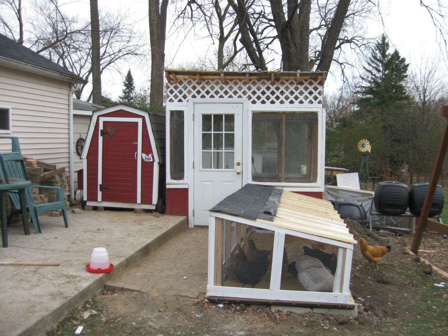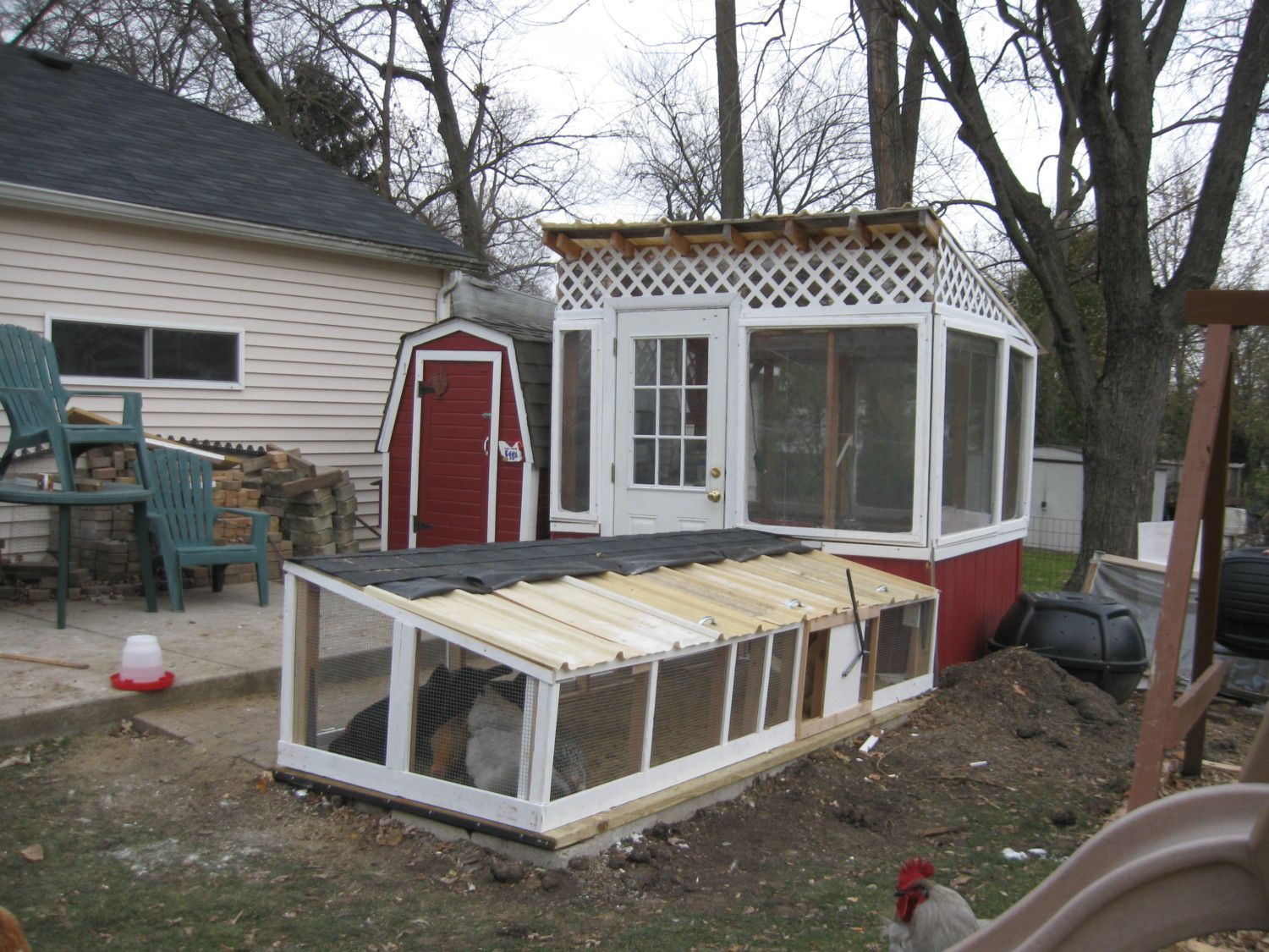 My poor Einstein is dropping more feathers today. I really wish the bald little hen would stay inside the coop. I must dig out a saddle ASAP. To make it worse, the run addition is being put into place now. My handyman is inside it & surrounded by curious chickens. Normally when it's this cold, they spend a lot of time inside the coop, but I guess they can't wait to use the new run. I'll send some pics when it's done.